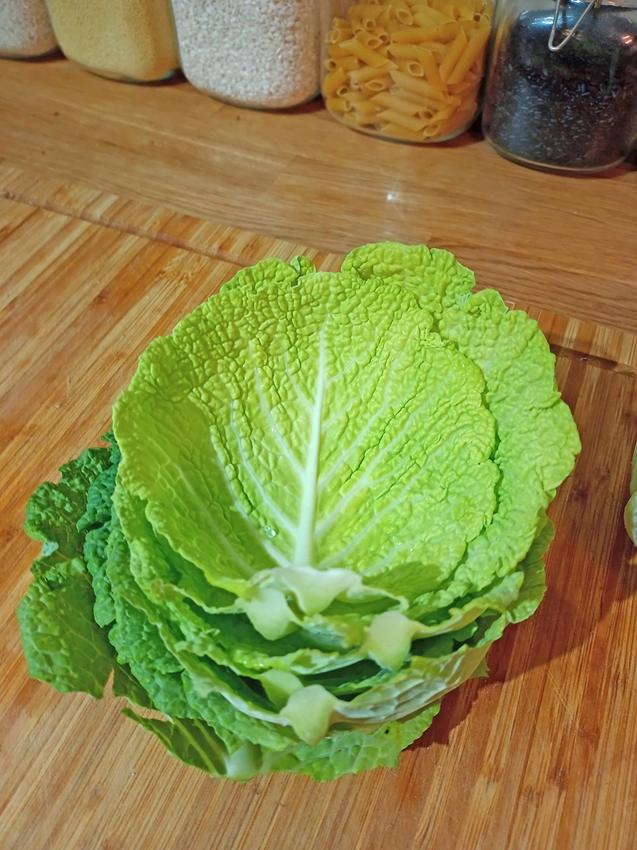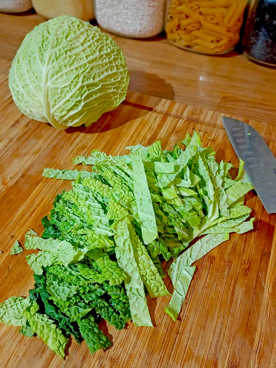 - Once you’ve removed the stalk from each leaf, cut the leaves into similar length strips then put into a large pan that has a lid. Add 125ml of water for every half head of cabbage, sprinkle over 1/2 tsp of salt for every half head of cabbage then put the lid on and turn the heat up to medium high.