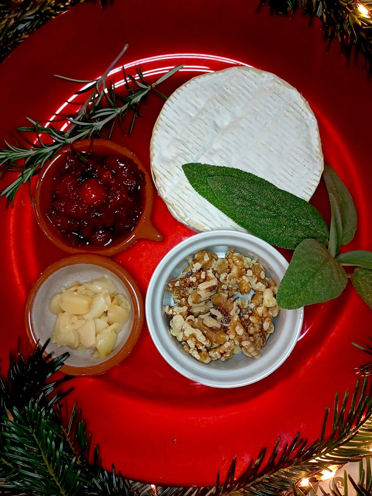- Remove the cheese from the oven and remove the herbs then top with the nut mixture and finish with the cranberry sauce. Serve with crackers, pistachios and grapes.