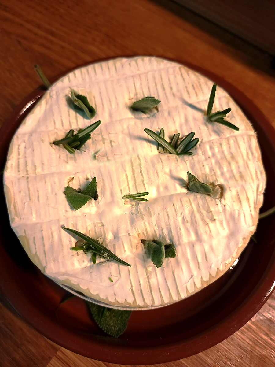 - Make several slits in the top of the cheese then poke rosemary and sage leaves into the holes. Place the cheese into the oven and bake for 15 minutes.