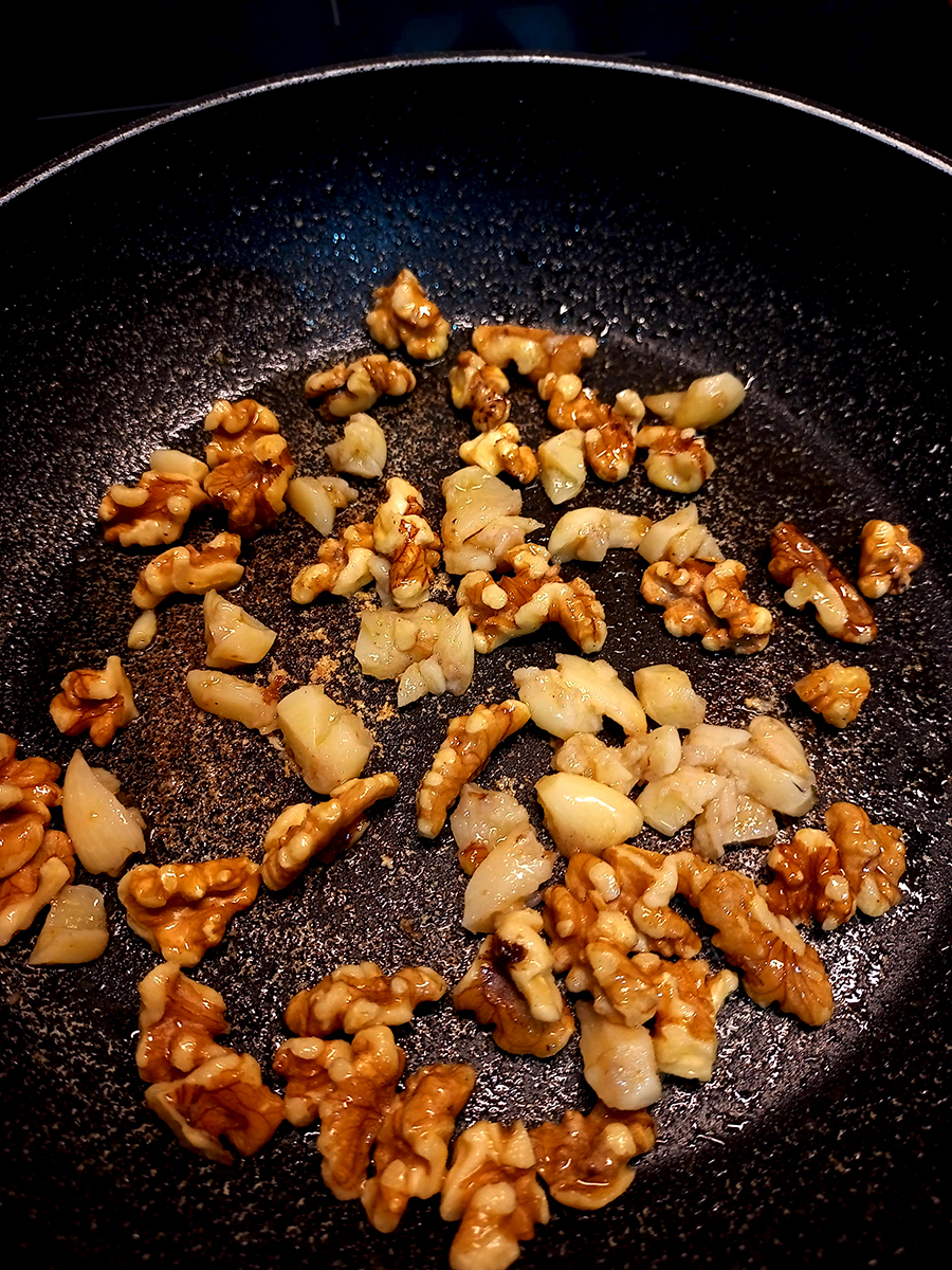 - Put the olive oil into a small frying pan over a medium low heat. Roughly chop the walnuts and roasted garlic (recipe here) then toast in the oil for a few minutes until they’re fragrant.