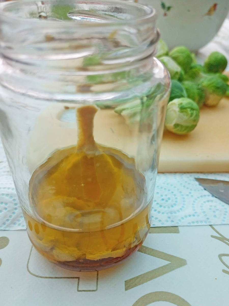 - Put all the ingredients for the dressing into a small jar (olive oil, mustard, syrup, vinegar and salt) and shake to combine.
