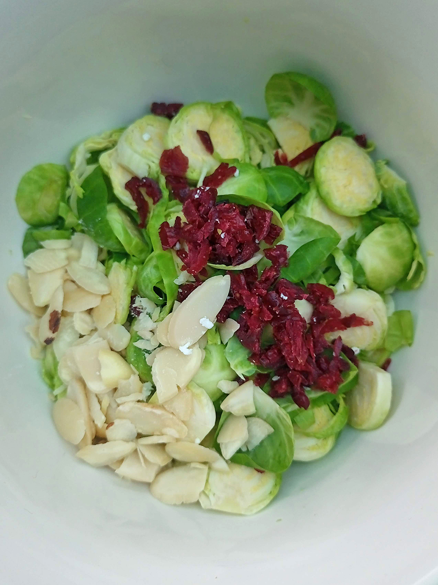 - Trim the base of each Brussel sprout then slice into thin strips. Loosen the sprouts into a bowl then add the almonds and cranberries.
