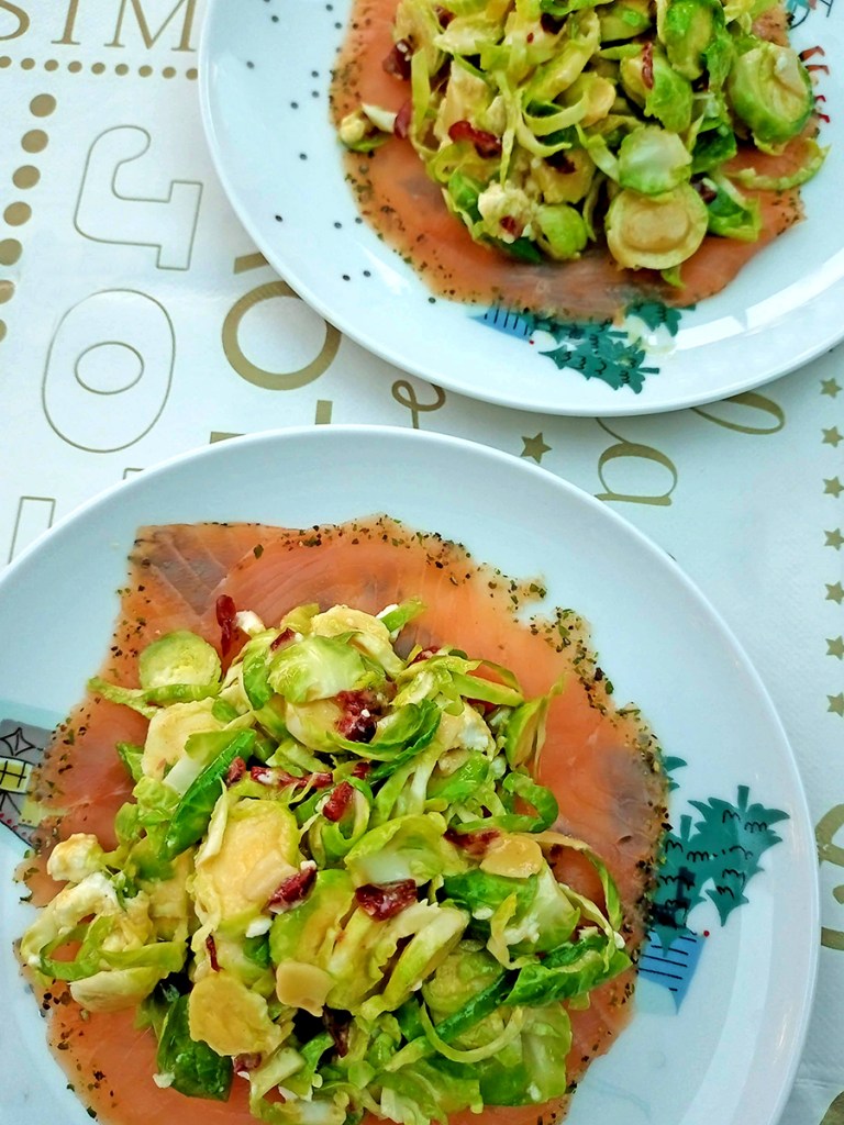 After the delicious roasted Brussels of Christmas Day I’m always happy to have a few raw sprouts left so I can make this amazing salad. The key to this dish is slicing the Brussels into thin slices. The fine strips of sprout soak up the delicious dressing but keep their crunchy texture. I serve this salad with roasted chicken thighs but my favourite is paired with smoked salmon.