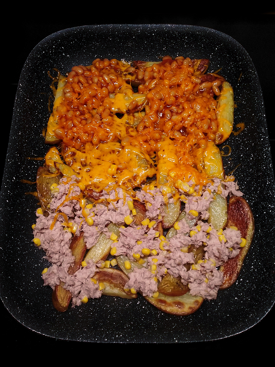 - Mix together the drained tuna, corn and mayo then grind over a little salt and pepper. Spoon the tuna over one half of the cooked potatoes then spoon the beans over the other half. Grate cheese over the beans then pop back into the oven for 2 minutes. Serve with chopped spring onion and cucumber slices.