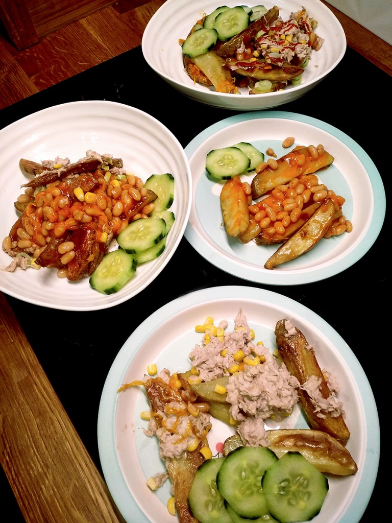 The kids went back to school today which signalled the end of eating brie every day and keeping up a regular intake of After Eights and getting back to regular cooking. When you have young kids, weekday meals don’t need to be easy, nutritious and adaptable. I often make jacket potatoes but potato trays are sometimes quicker to prepare and easier to serve. I can do a half and half tray so that Evelynne gets her tuna fix whilst Henry’s side stays puritanically beans and cheese. You can choose the toppings that your kids love. Paul and I divvy up what’s left and squeeze over sriracha.