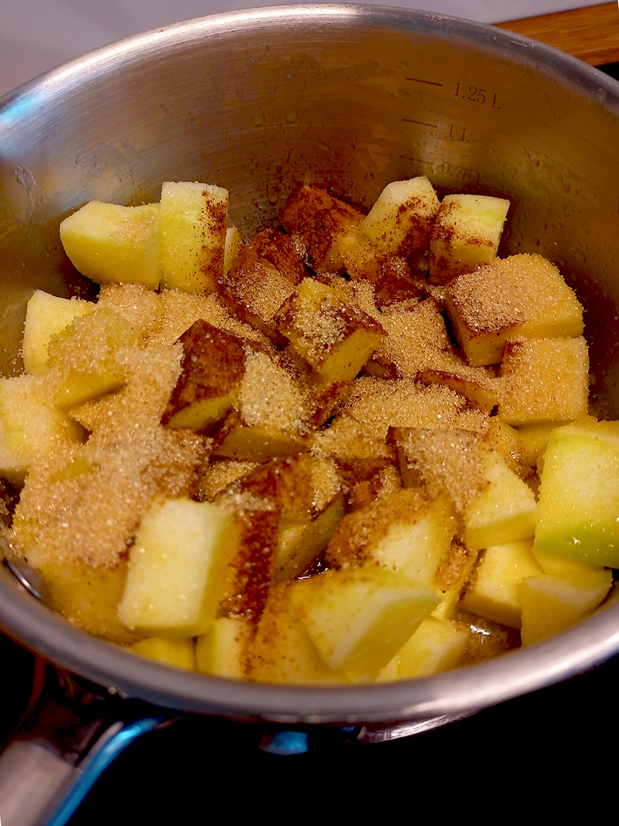 - Peel and core the apple then cut into large cubes. Melt the butter in a small saucepan (that has a lid) on a medium high heat then add the apple to the pan.