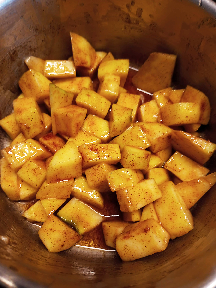 - Add the spices and sugar then toss to coat the apples in the butter, sugar and spices and turn the heat down to medium/medium low. Put the lid on the pan and cook for 10 minutes (give it a stir after a few minutes to check if the apples are catching on the bottom so you can turn the heat down).