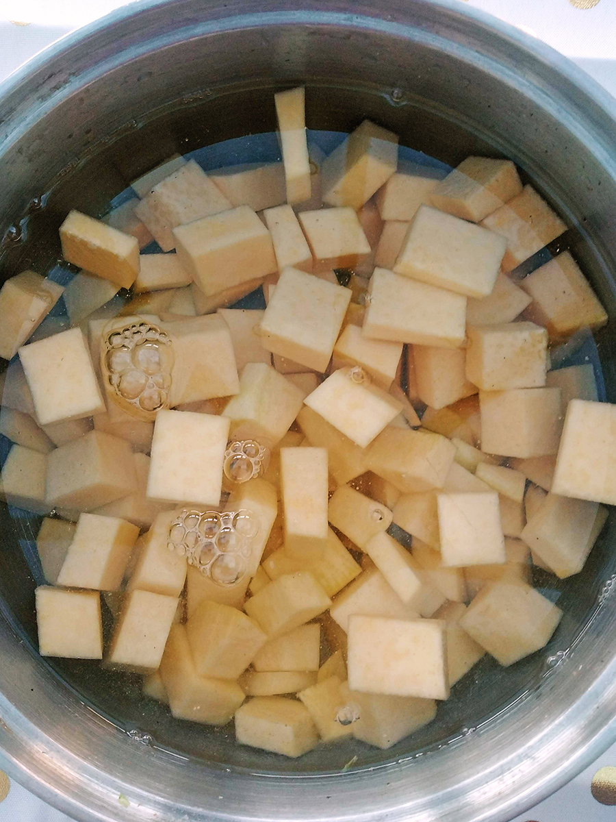 • Use a horizontal peeler to peel the swede then dice and place into a large saucepan. Cover the swede with water then add the salt.