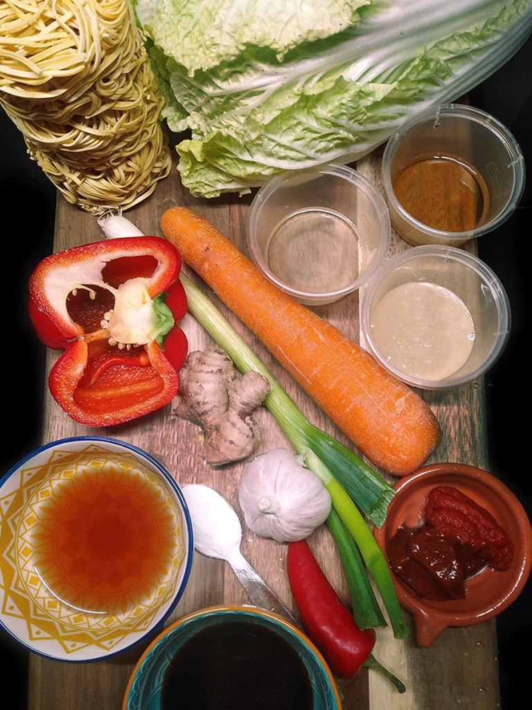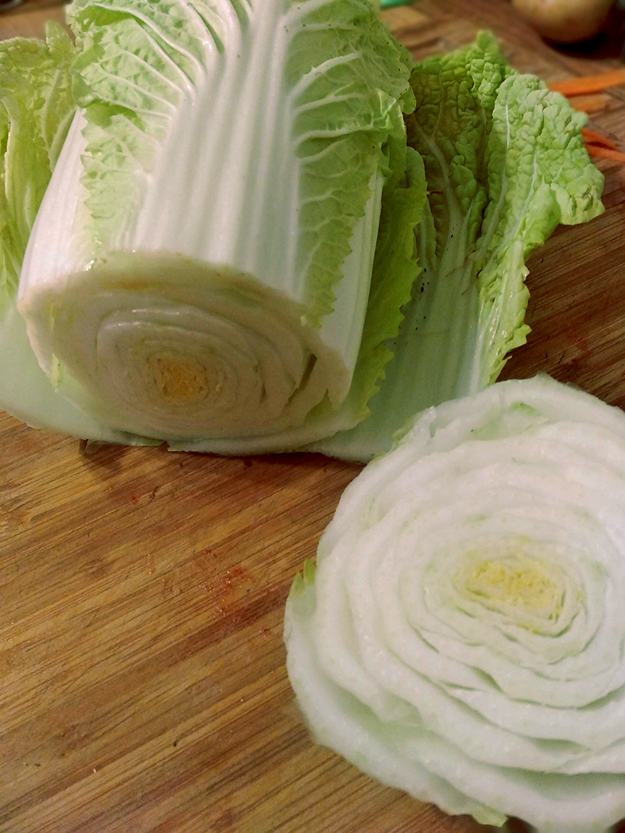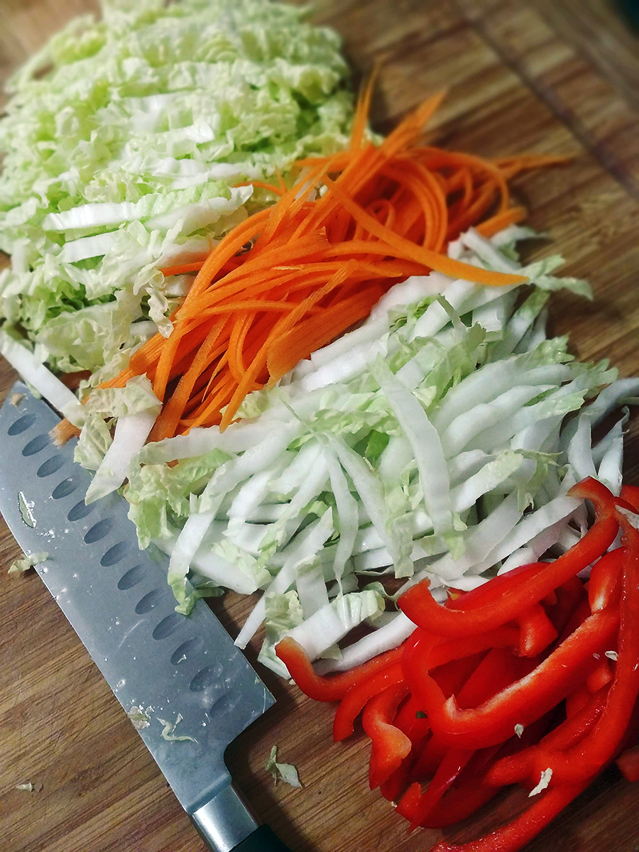 - Cut the bottom off the cabbage then separate the leaves and chop the soft green part into one pile then the crunchy white part into another pile. De-seed the pepper and chop then finely chop the carrot or use a julienne peeler to create carrot ribbons. Peel and chop the garlic and ginger.