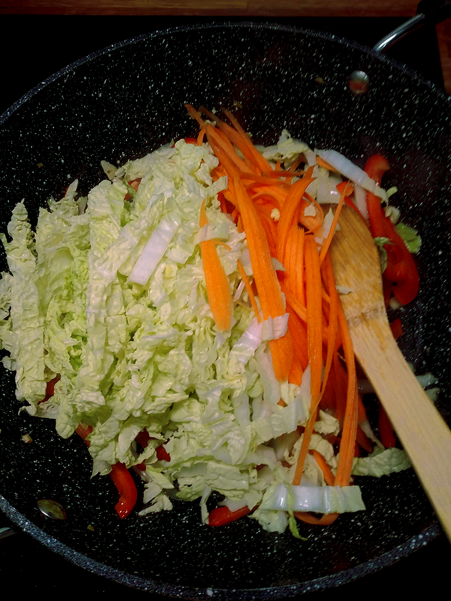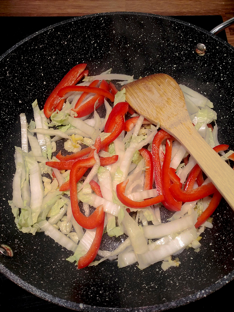 - Put a little vegetable oil into a wok or large frying pan on a medium high heat. Add the crunchy, white part of the cabbage and the red pepper to the pan and cook for a couple of minutes. Add the garlic and ginger to the pan (and chopped chilli if using) and cook for a minute then add the green part of the cabbage and the carrot. Stir regularly.