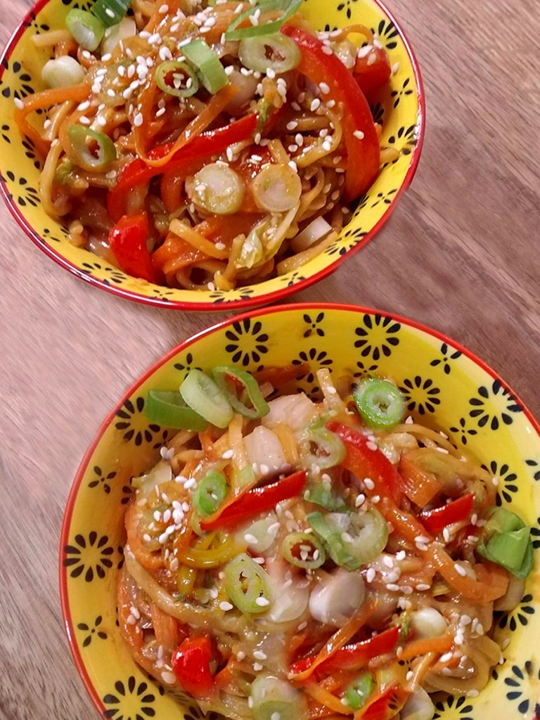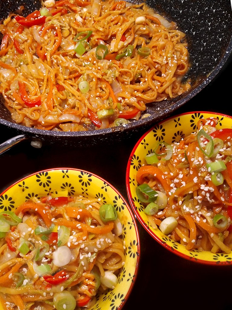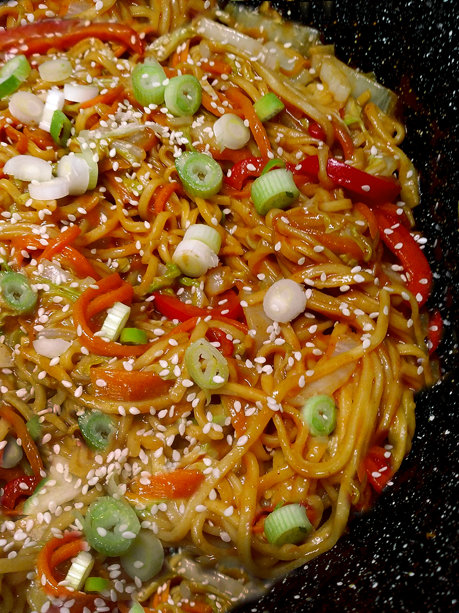 - Add the drained noodles to the pan and pour over the sauce then toss to coat everything in the sauce. Finely chop the spring onion and sprinkle over the stir-fry along with sesame seeds.