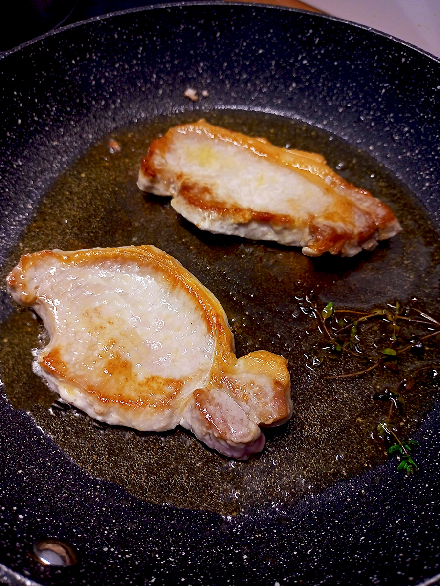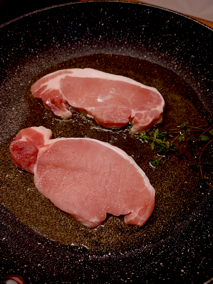 - Dry and salt the pork chops then put the olive oil in a large frying pan on a medium high heat. Once the oil is hot add the chops to the pan along with a couple of thyme sprigs and cook until you can see the meat is cooked halfway through then turn over and cook for half the time again (for example; if the first side took 4 minutes, the second side takes 2 minutes).
