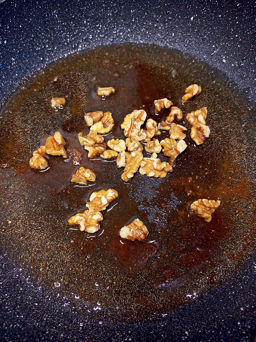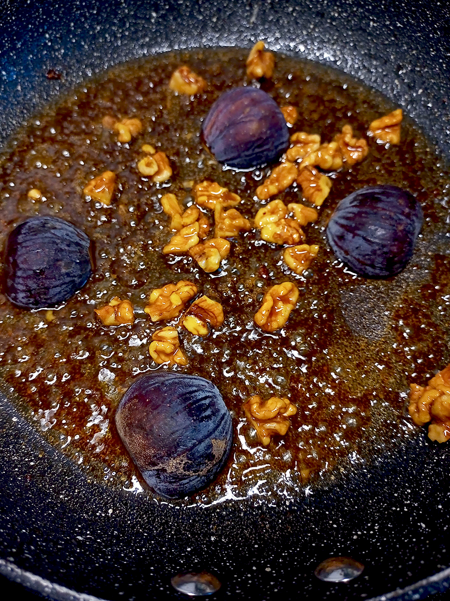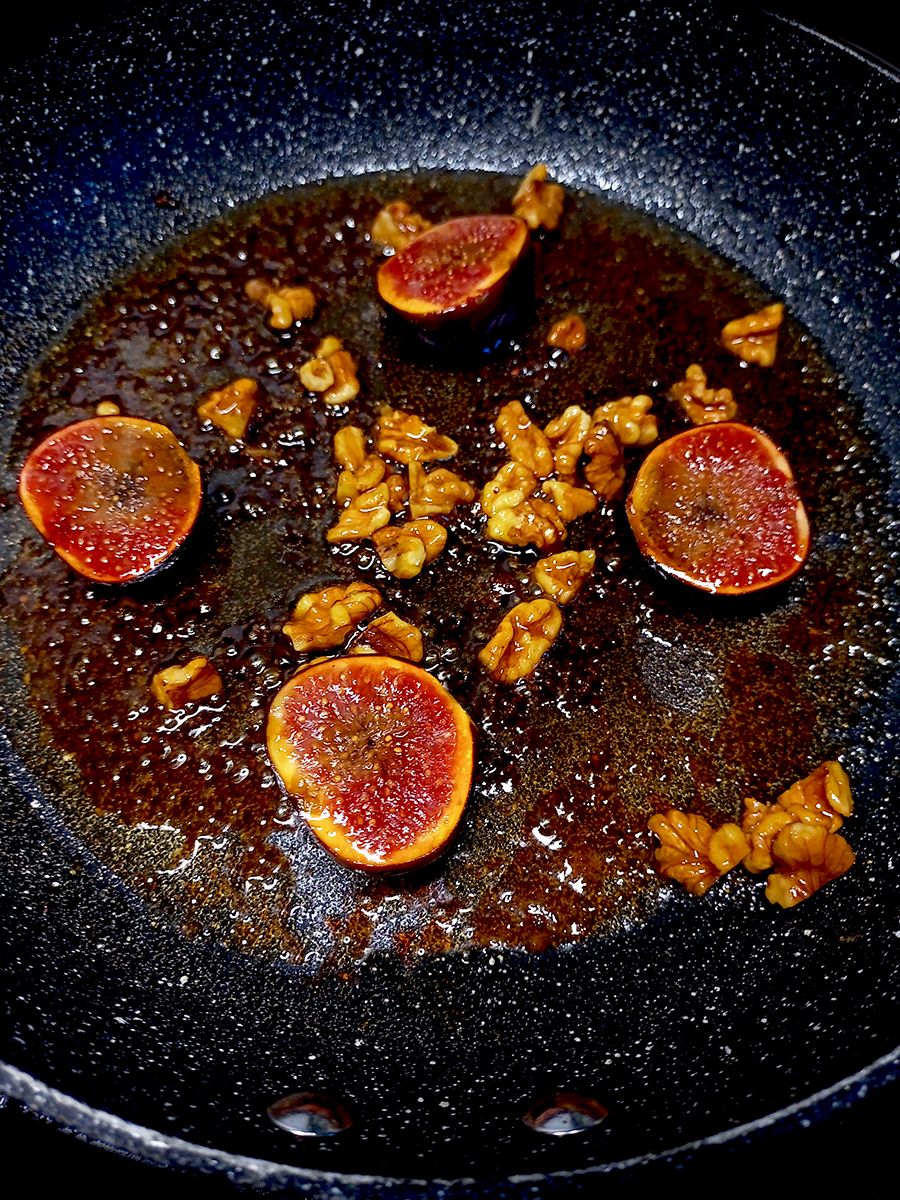 - Remove the chops and thyme from the pan and rest the pork on a plate. Add the walnuts to the pan and cook for a minute before adding the maple syrup and halved figs, cut side down, to the pan and cook for another minute then turn the figs over. Squeeze the lemon over and stir everything to make a sauce. Add any resting juices from the pork to the sauce.