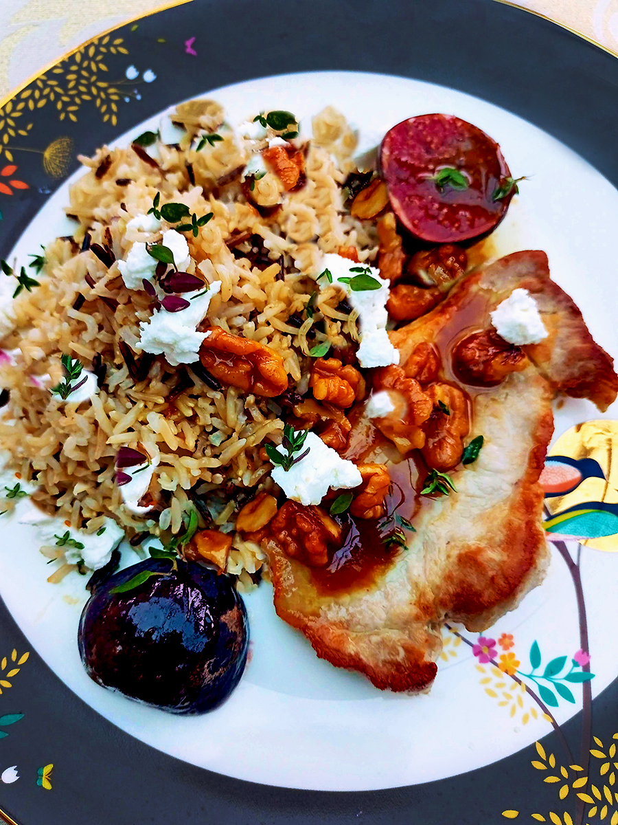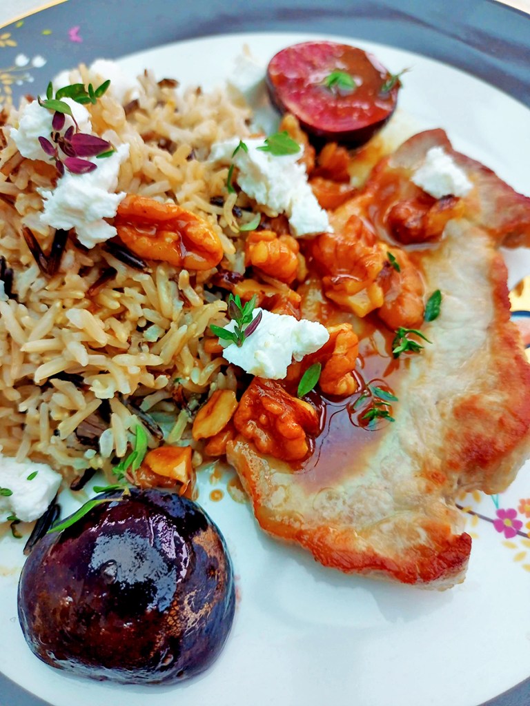 - Serve the cooked, drained rice with the pork chops, walnuts and figs then crumble over some feta and fresh thyme leaves then drizzle with the sauce.