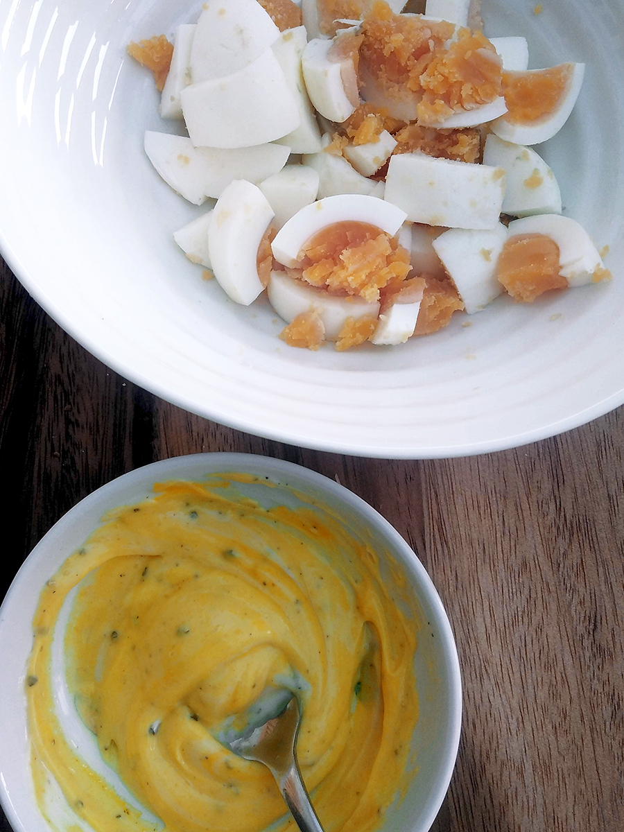 - Boil a couple of eggs for 8 minutes then leave to cool completely in the shell. (I boil the eggs in the morning so that they’re ready for lunchtime).