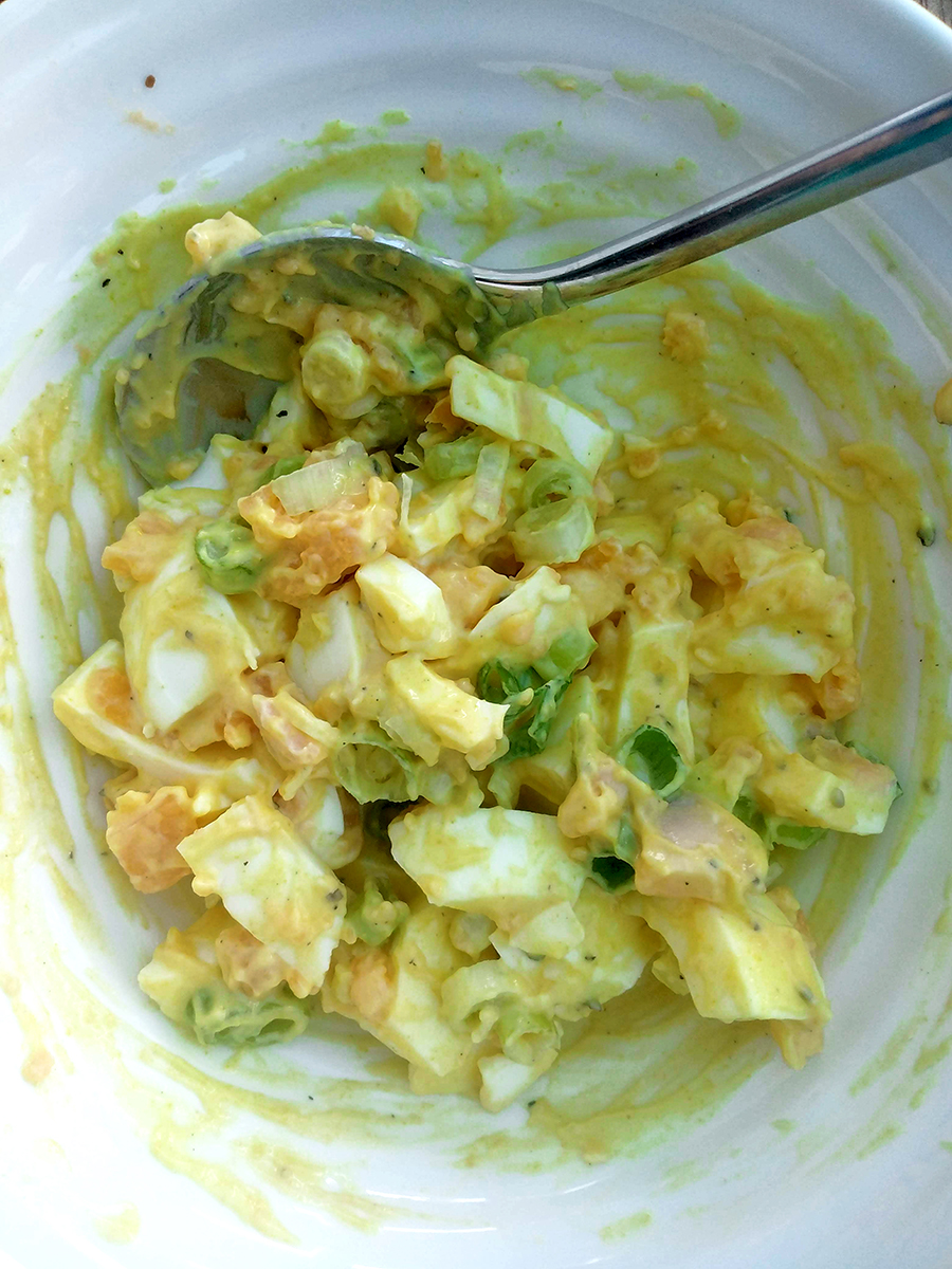 - Shell the eggs and roughly chop them and the spring onion then put into a bowl. Mix together the mayo and mustard then grind over some salt and pepper. Spoon the mayo mixture over the eggs and onion then gently mix. Toast the bread then spread the mixture on top and sprinkle over the cress.
