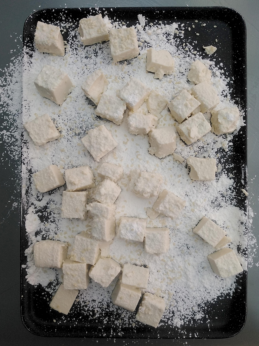 - Dry the tofu then carefully cut into cubes and place on a tray. Sprinkle over some sesame seeds then sift over with cornflour, turn each piece and sift over more cornflour.