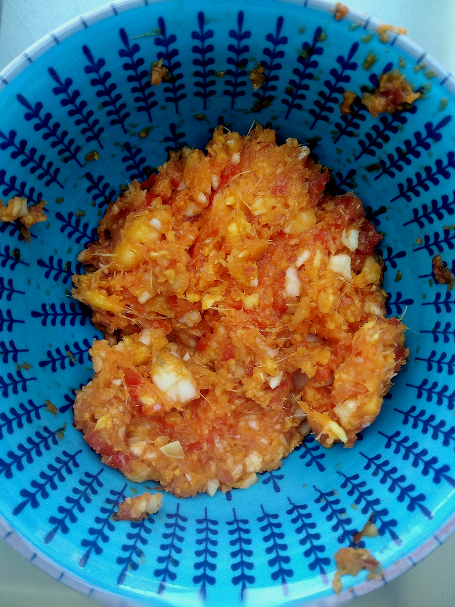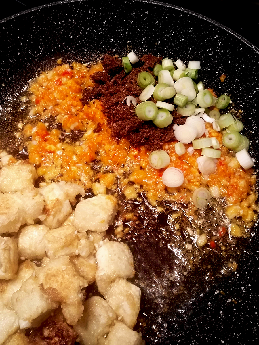 - Once it’s cooked moved the tofu over to one side of the pan then add the chilli mixture and fry for a minute before adding the sugar and chopped spring onion.