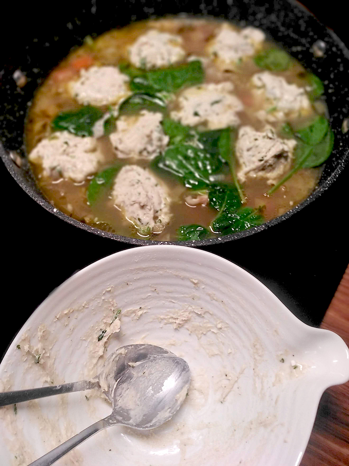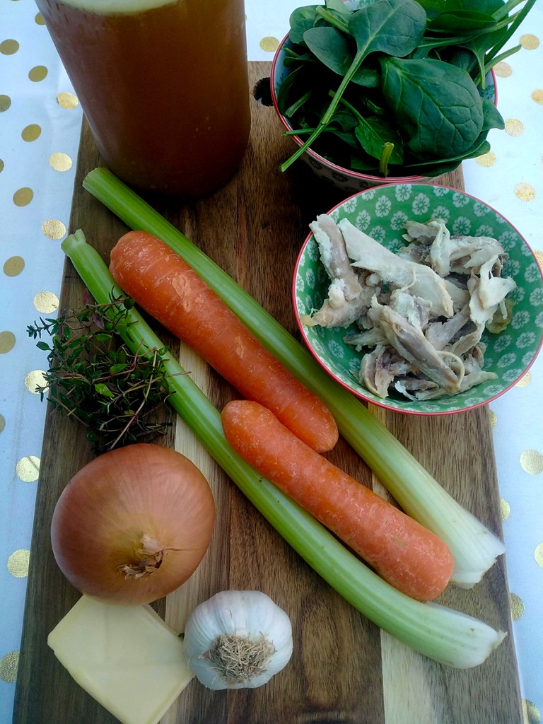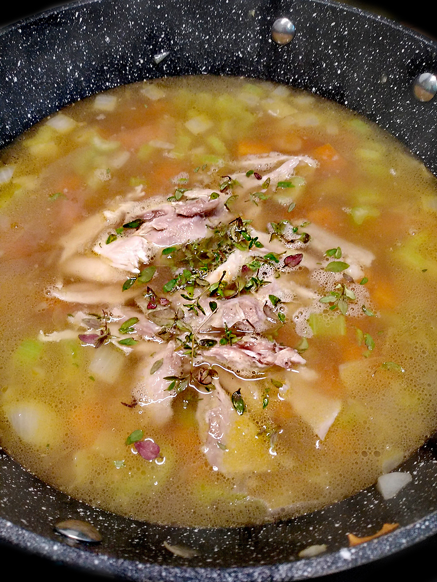 - Add the stock, chicken and thyme leaves, turn the heat down to medium, pop the lid on and cook for 15 minutes. Taste the broth and adjust the seasoning with salt and pepper. Add the spinach and stir then add the dumplings (recipe below) and cook for 15 minutes with the lid on.