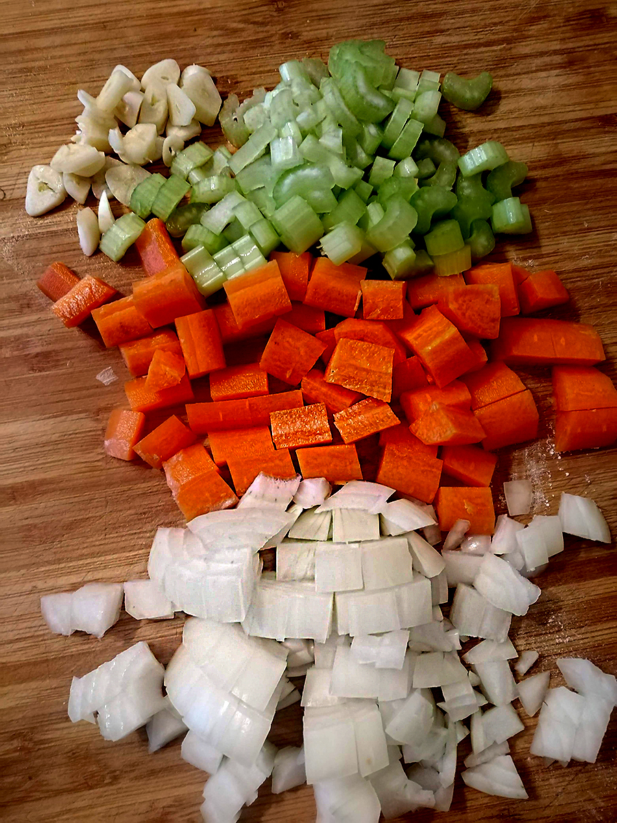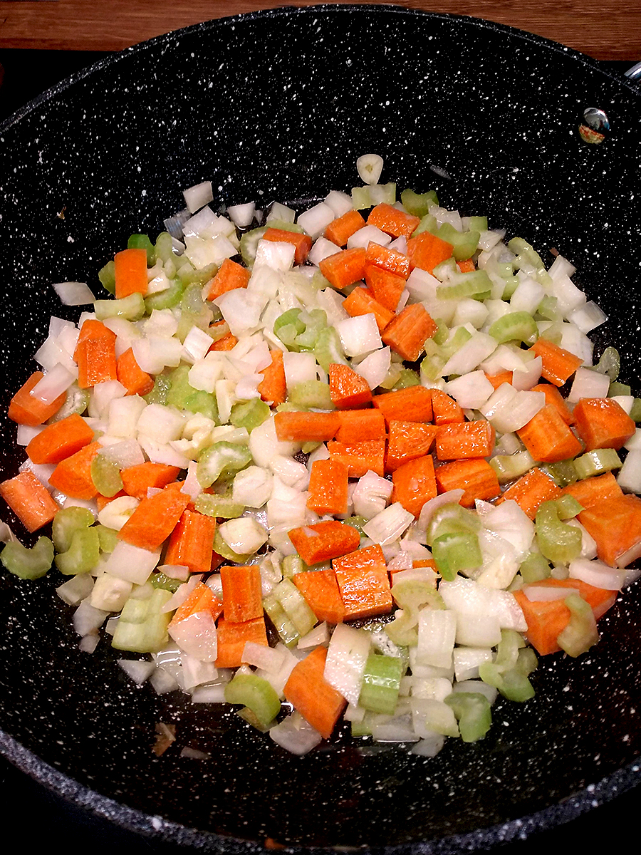 - Peel and chop the onion, carrot, garlic and celery. Melt the butter in a large skillet then add the veggies and grind over with salt then sauté for 5 minutes, stirring regularly.