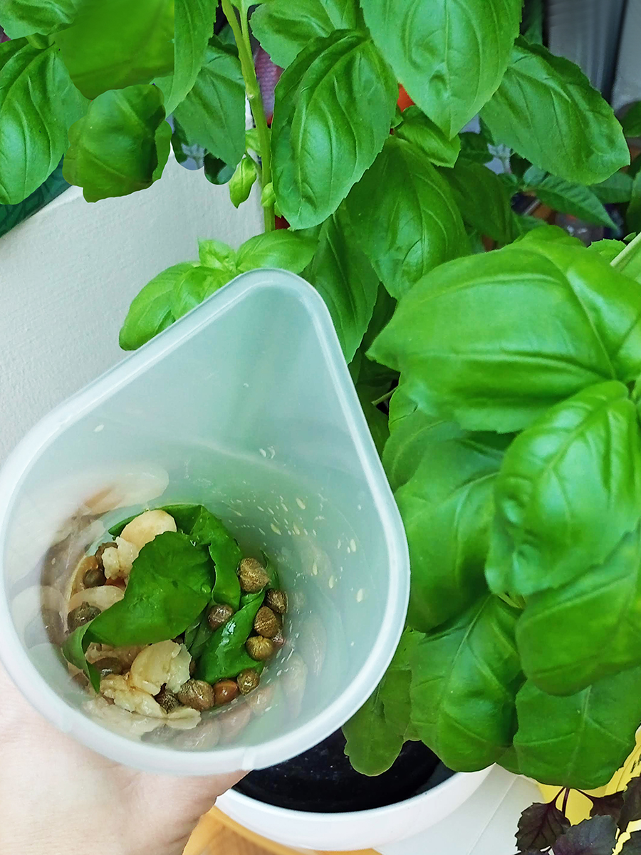 - Put the basil, roasted garlic, capers and olive oil into a plastic beaker then blitz with a hand blender. Add a little more olive oil if you want a looser pesto.