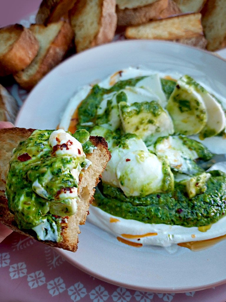 - Spread some Greek yoghurt onto a plate and drizzle over some chilli oil then either slice or tear apart the mozzarella and place it on top of the yoghurt. Spoon over the pesto then sprinkle over with sea salt and serve with warm, toasted bread.