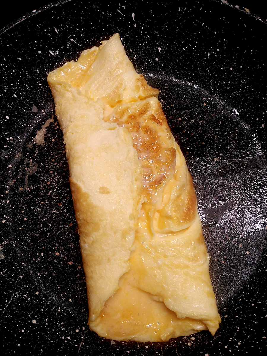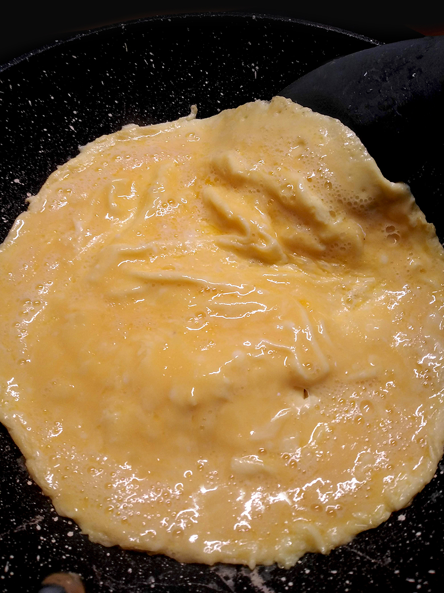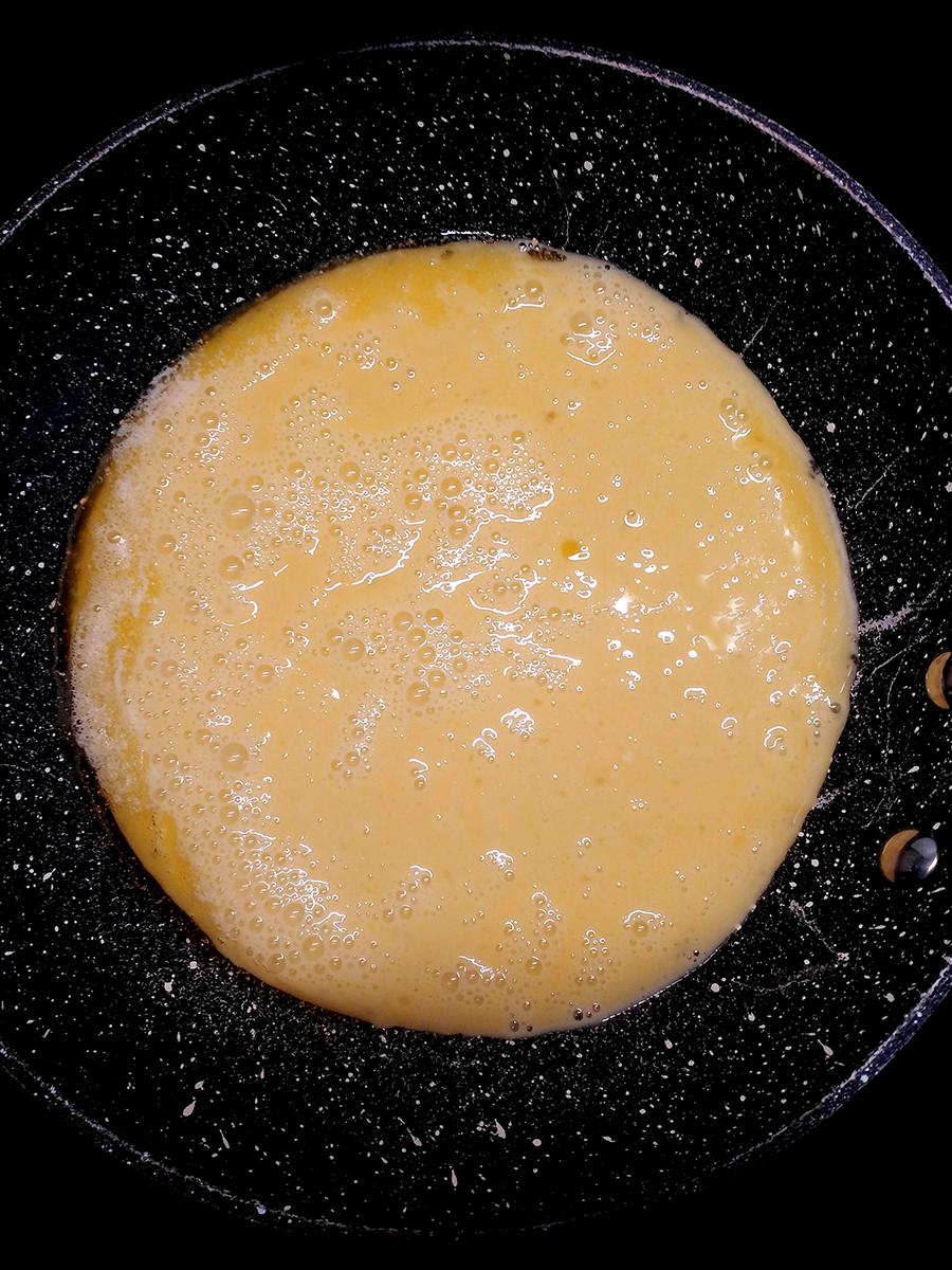 - Crack the eggs into a bowl then whisk thoroughly until there is no distinct white and yolk. Melt the butter in a small, non-stick frying pan on a medium to medium-high heat.