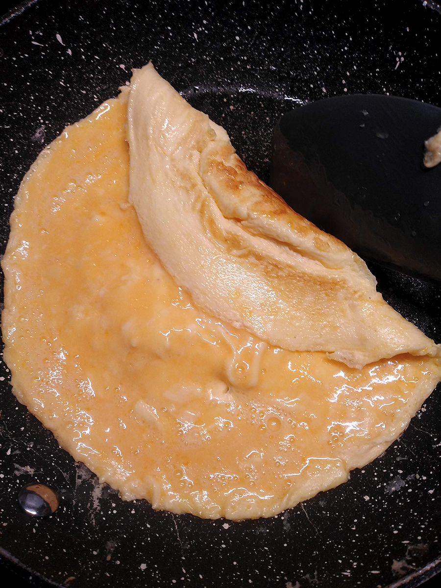 - Reduce the heat to medium and allow to cook slowly for 3 minutes until you can easily slide the spatula under one edge of the omelette and fold it towards the centre.
