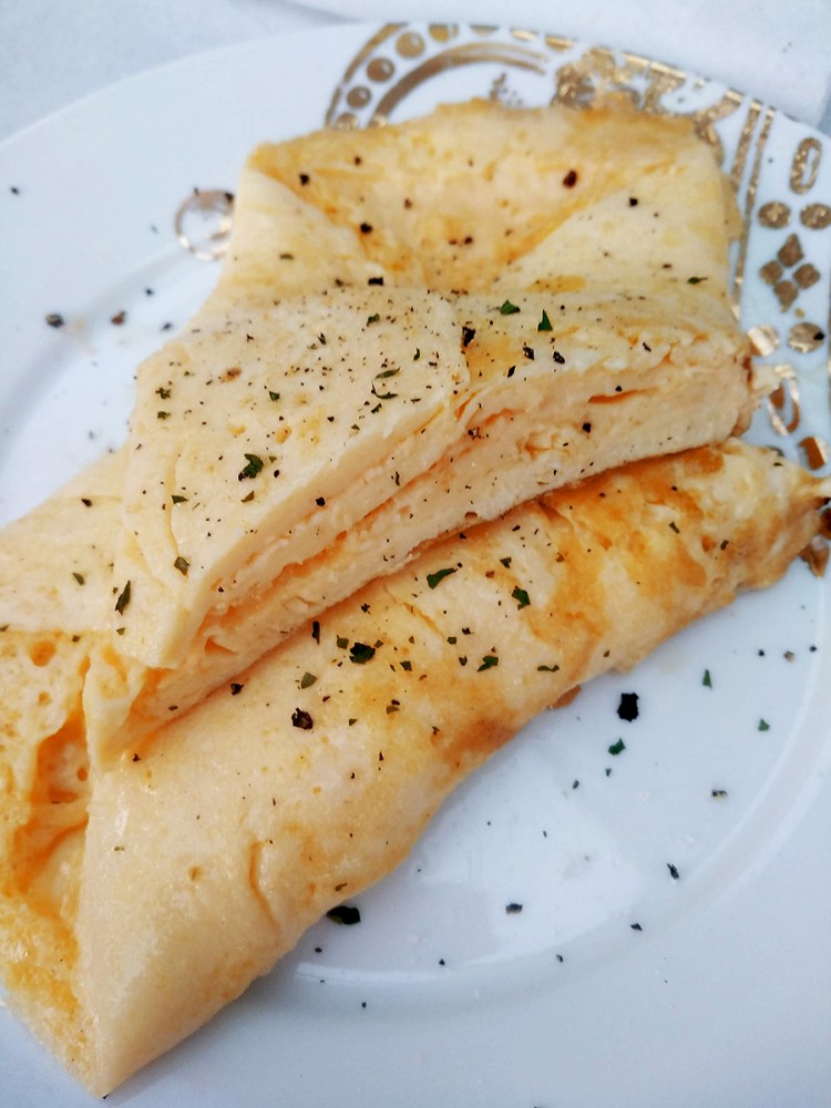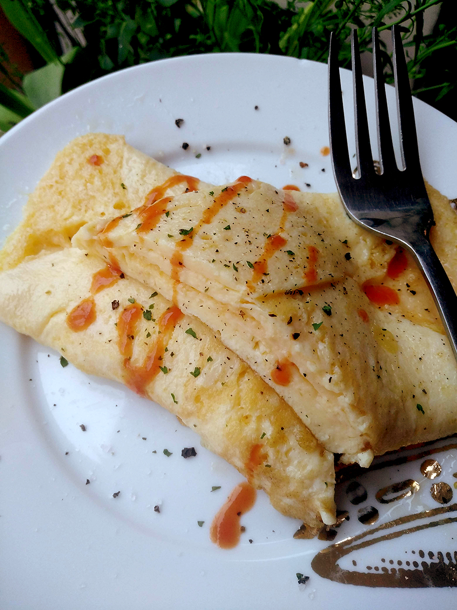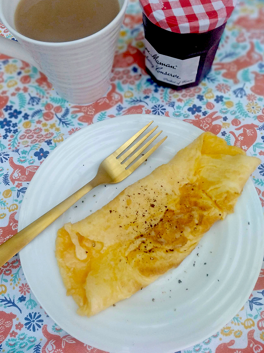 The difference between an OK omelette and a great one lies is patience. A lot of omelettes are cooked too quickly but with a little care you can create a delicious, soft, creamy omelette. My top tips for getting the best results are: 1) don’t add milk to the eggs 2) use a soft spatula to fold 3) don’t fold in half, instead fold in thirds. Before folding you can grate over some sharp cheese or simply grind over with salt and pepper.