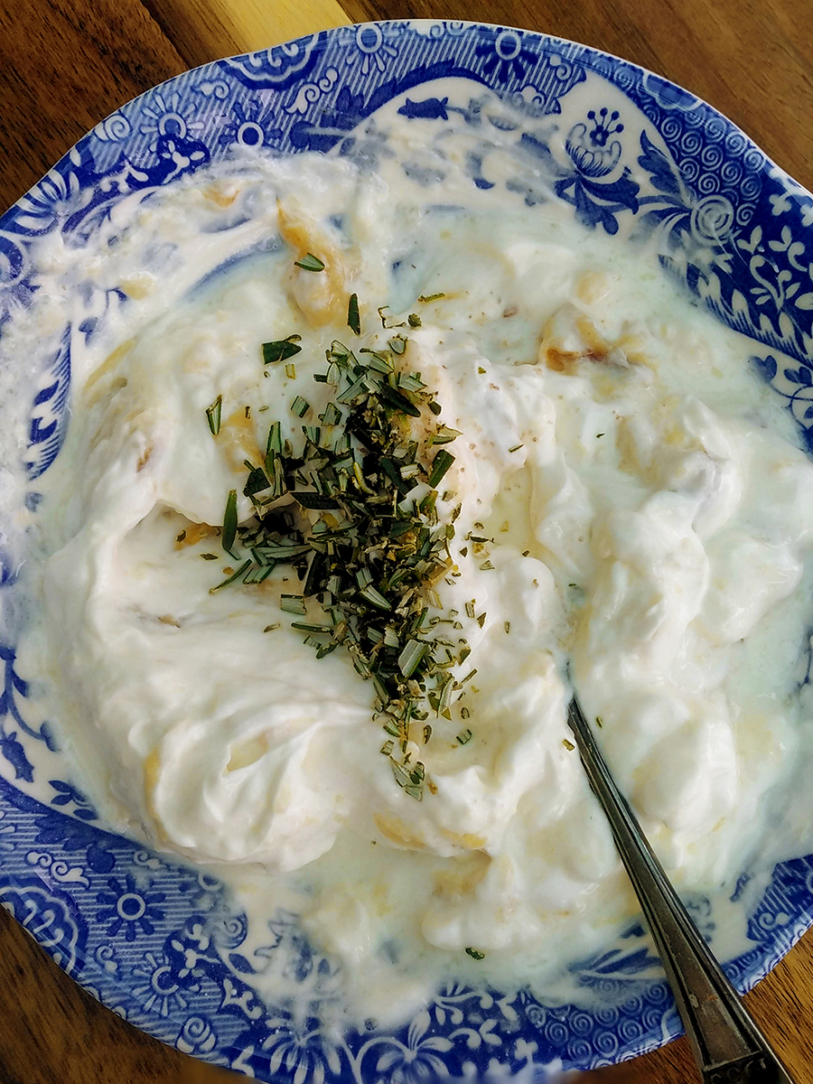 - Pop the tray into the oven and roast for 45 minutes. Remove the garlic bulbs from the tray then carefully squeeze from the base to pop the cloves out. Chop some fresh rosemary and the roasted garlic then stir into the yoghurt and serve with the chicken and tomatoes.