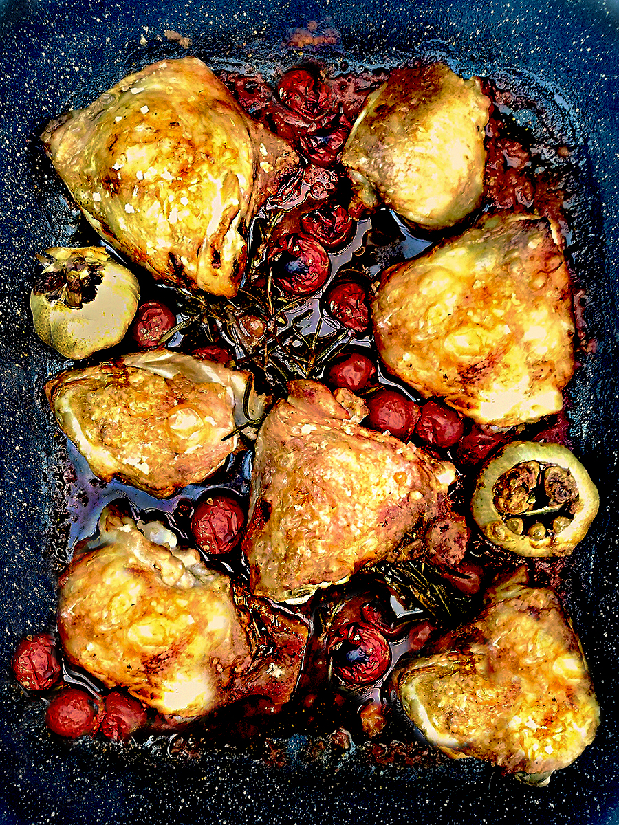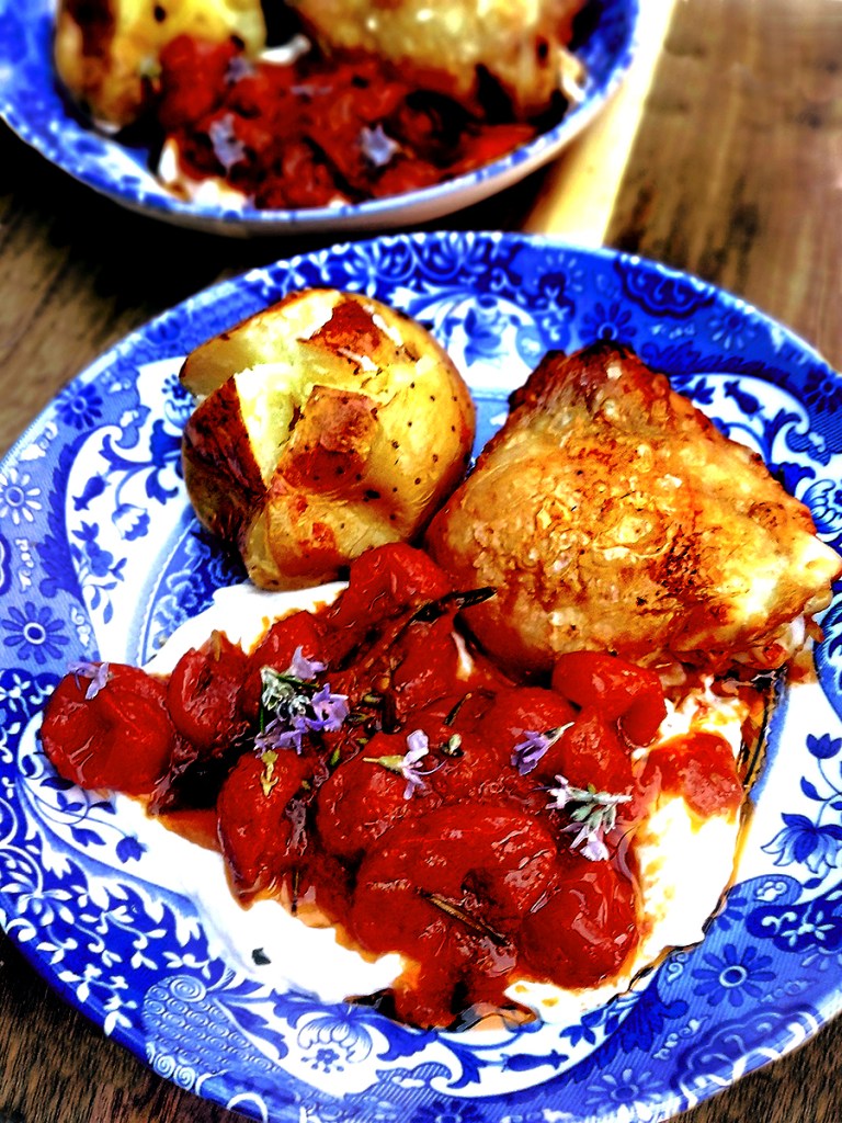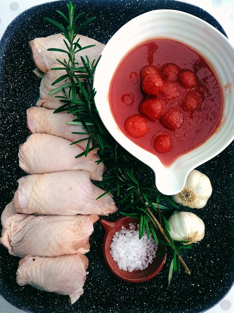 In my house a tray of roasted chicken thighs is the start of many weeknight meals. I make Chicken and Cherry Tomatoes year round because I use tinned cherry tomatoes. I’m a big fan of tinned goods because they’re cheap, preserved at the height of their flavour and on hand at a minute’s notice from the pantry. I love a recipe with very few ingredients that delivers a lot of flavour which is why I keep coming back to this dish which I serve with rice or jacket potatoes.