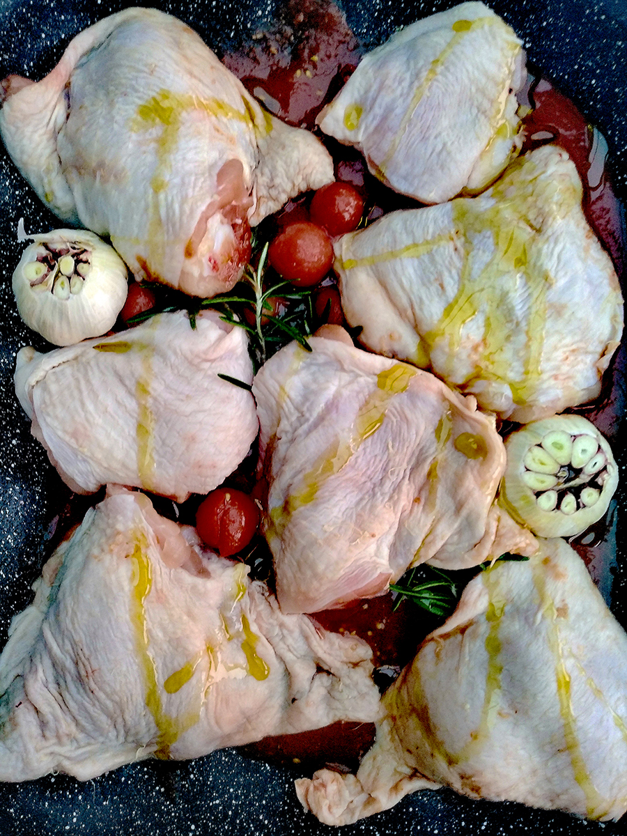 - Dry the chicken thigh skins with paper towel then arrange on top of the tomatoes and rosemary (ensuring space around each thigh). Drizzle some olive oil over the thighs then either rub or brush the oil into the skins then sprinkle the rest of the salt over the chicken.