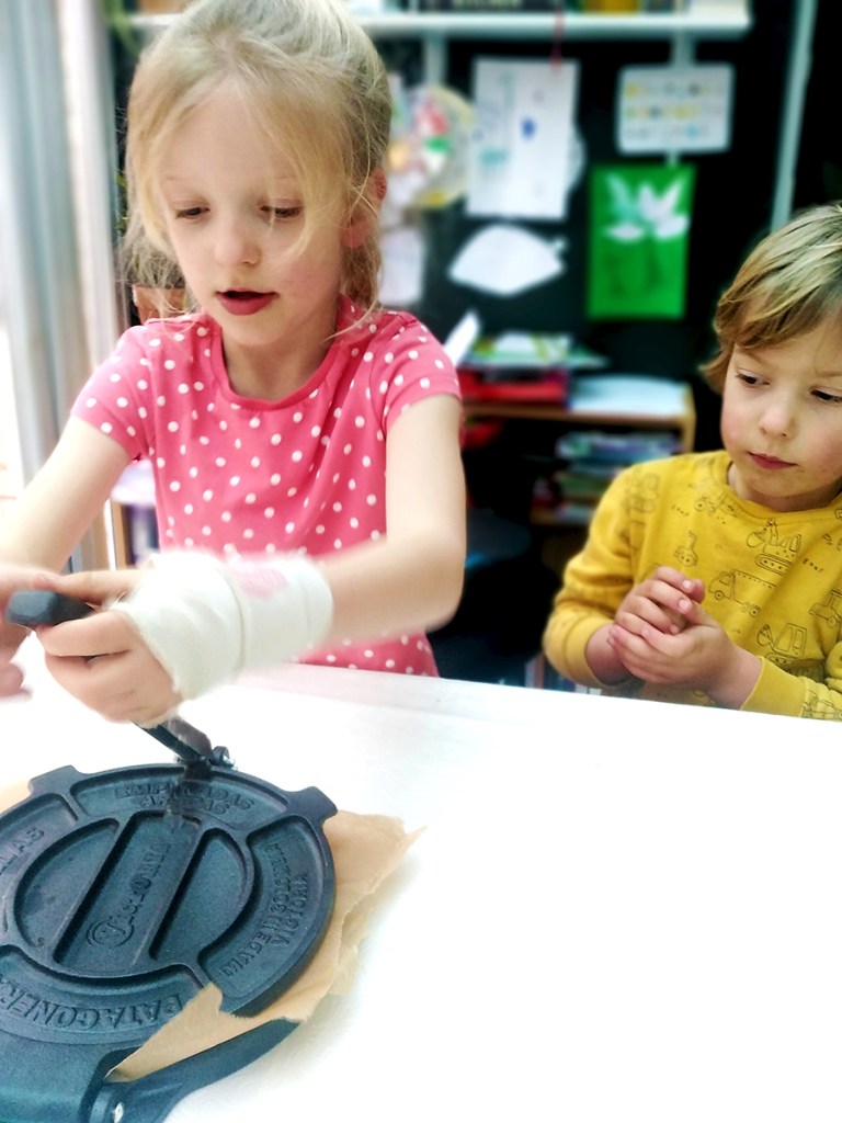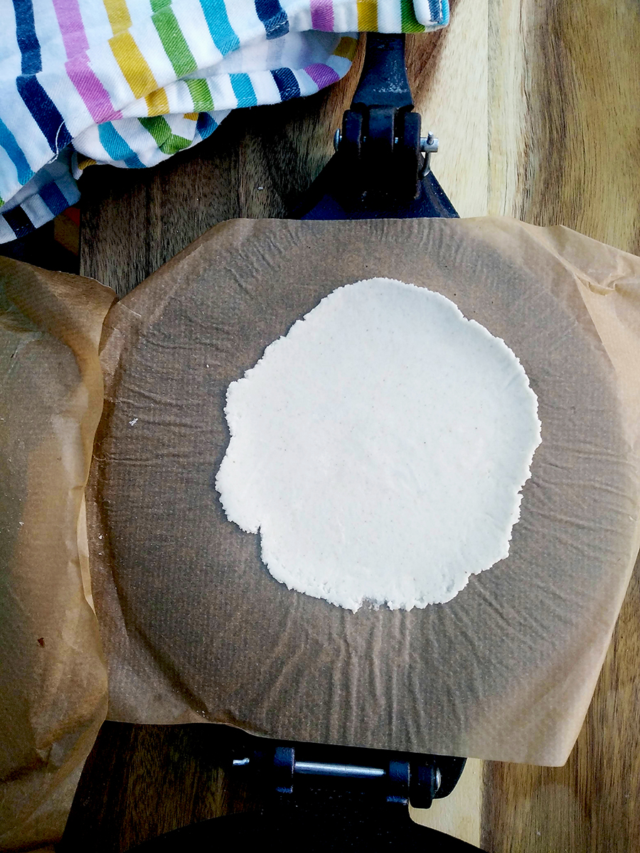 - Cut 19 pieces of greaseproof paper or reusable bee’s wax paper the size of the press. Place a piece of paper on the tortilla press then pinch off a golf ball sized piece of dough and roll then place it in the centre of the press and top with another piece of paper then close the press and squeeze the handle.