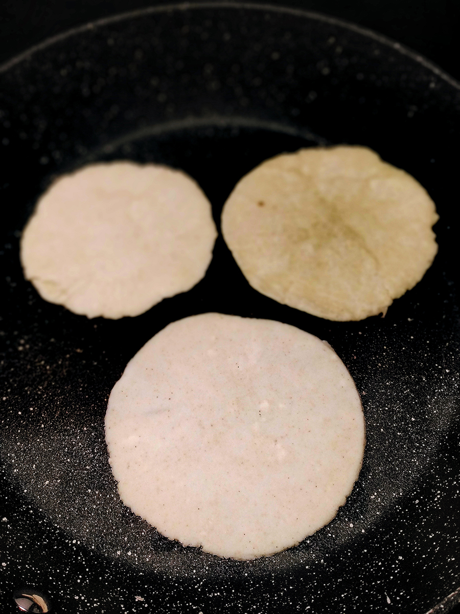 - Heat a heavy or cast iron pan on a high heat then cook the tortillas either individually or in batches if your pan is large enough. Cook on one side for about 45-60 seconds until it takes on a little colour then flip and repeat. Stack cooked tortillas in the clean tea towel in a warm place until you’re ready to serve.
