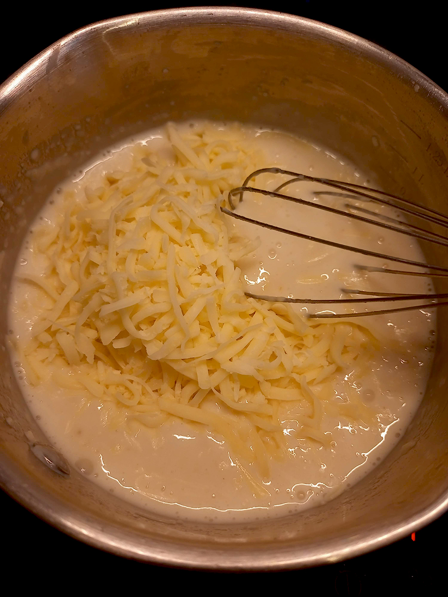 - Melt the butter in a small pan over a medium high heat. Add the flour and whisk for a minute then gradually add the milk and keep whisking until all the milk is added and the sauce is smooth. Turn the heat down to medium and add the cheese then stir until it’s completely melted then keep the sauce on a low heat.