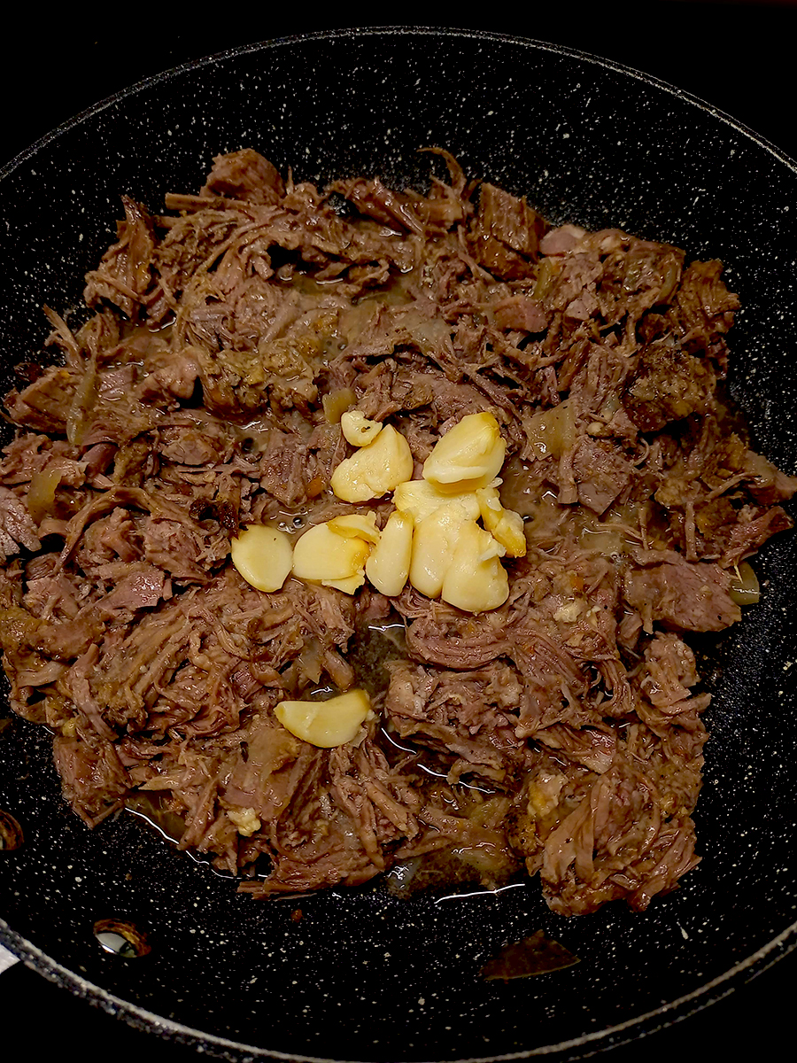 - Cook the pasta in a large pot of boiling, salted water. Roughly chop the beef and garlic then add to a large skillet on a medium high heat and grind over with salt and pepper.