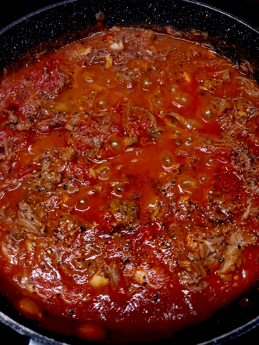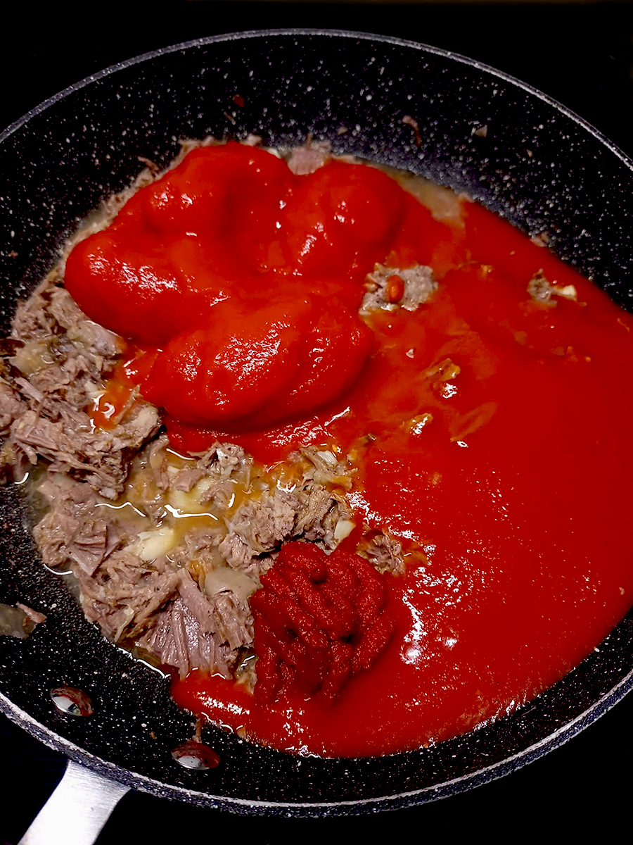 - Add the whole tomatoes, passata, tomato puree and stir, breaking up for the whole tomatoes. Grind over again with salt and pepper and cook on a medium heat.