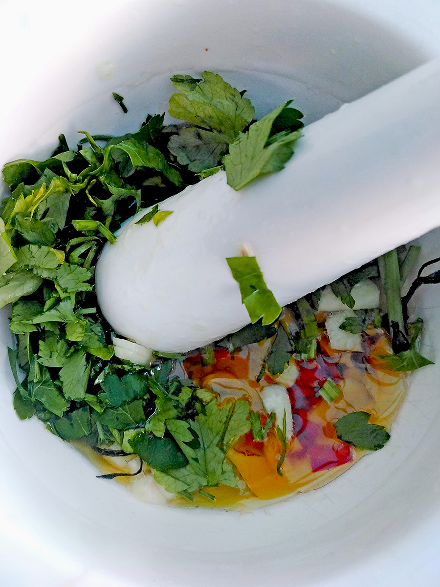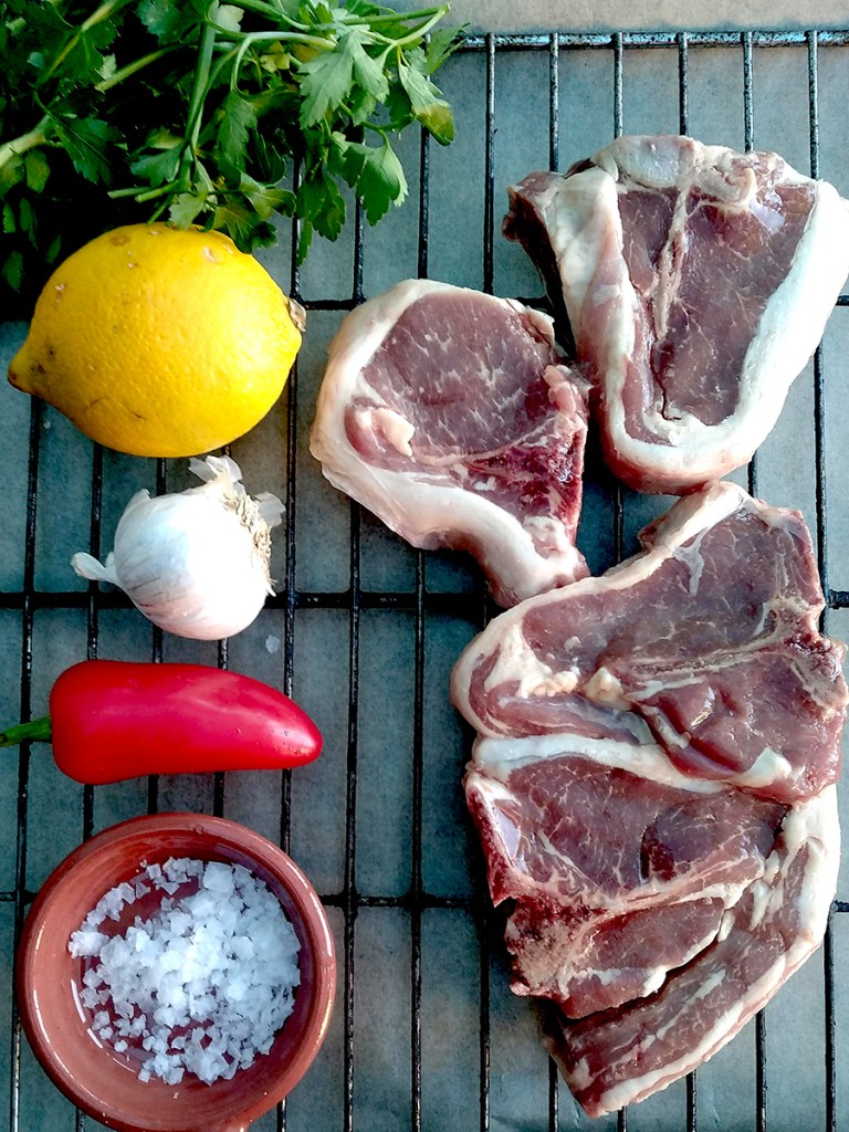 - Peel and chop the garlic then chop the chilli and put them into a mortar bowl along with the salt, olive oil and half the parsley. Grind the ingredients together with the pestle. Put the chops into a bowl then pour over the garlic mix and rub into the meat. Leave for 10 minutes.