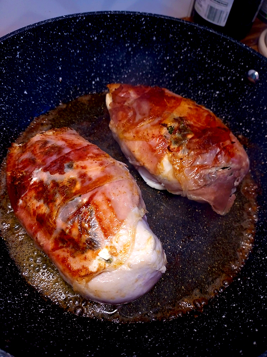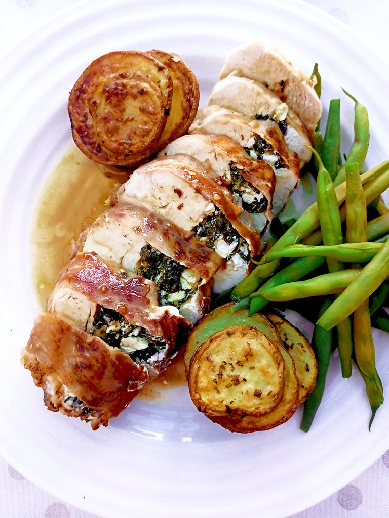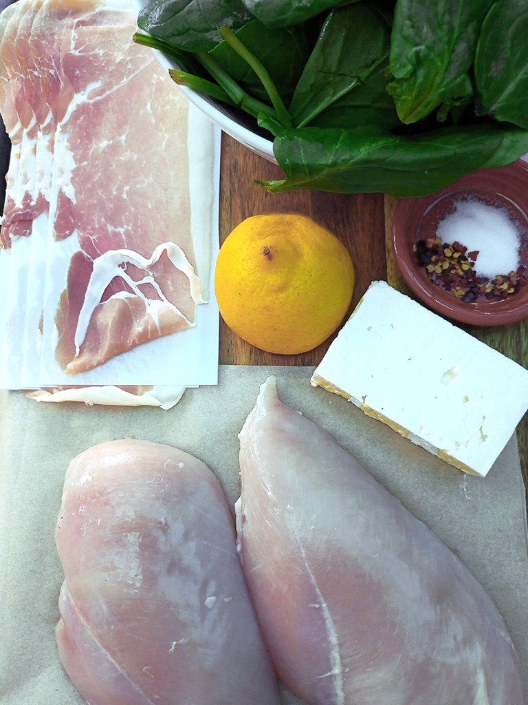 As spring edges its way in (through the odd snow shower) I like to make a lighter Sunday lunch from time to time. It takes a little effort to prepare the chicken breasts but the cooking is incredibly easy and the result is so worth while. Spinach is one of my staples for managing my brain health as the iron helps to regulate energy and mood. Wrapping the chicken breasts in prosciutto or Parma ham keeps the filling in place, protects the delicate chicken and adds a great crispy texture to the dish.