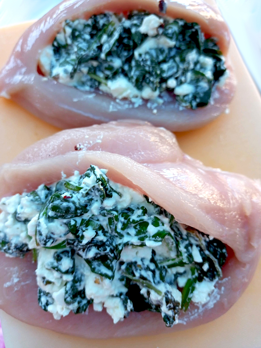 - Carefully make a horizontal slice 3/4 of the way through the chicken breasts then fill the cavity with the spinach mixture. Wrap the ham slices around the chicken breasts ensuring that the stuffing is completely covered.