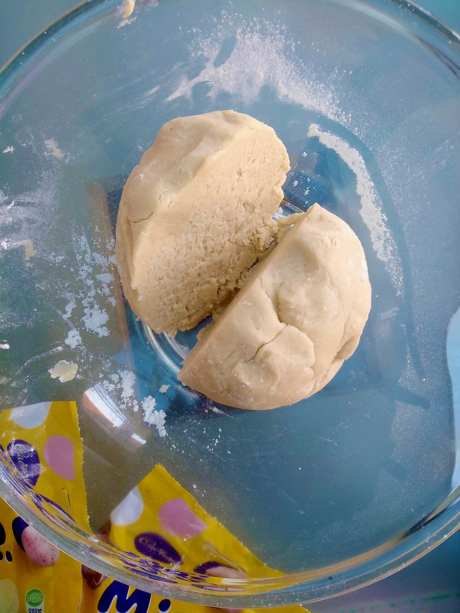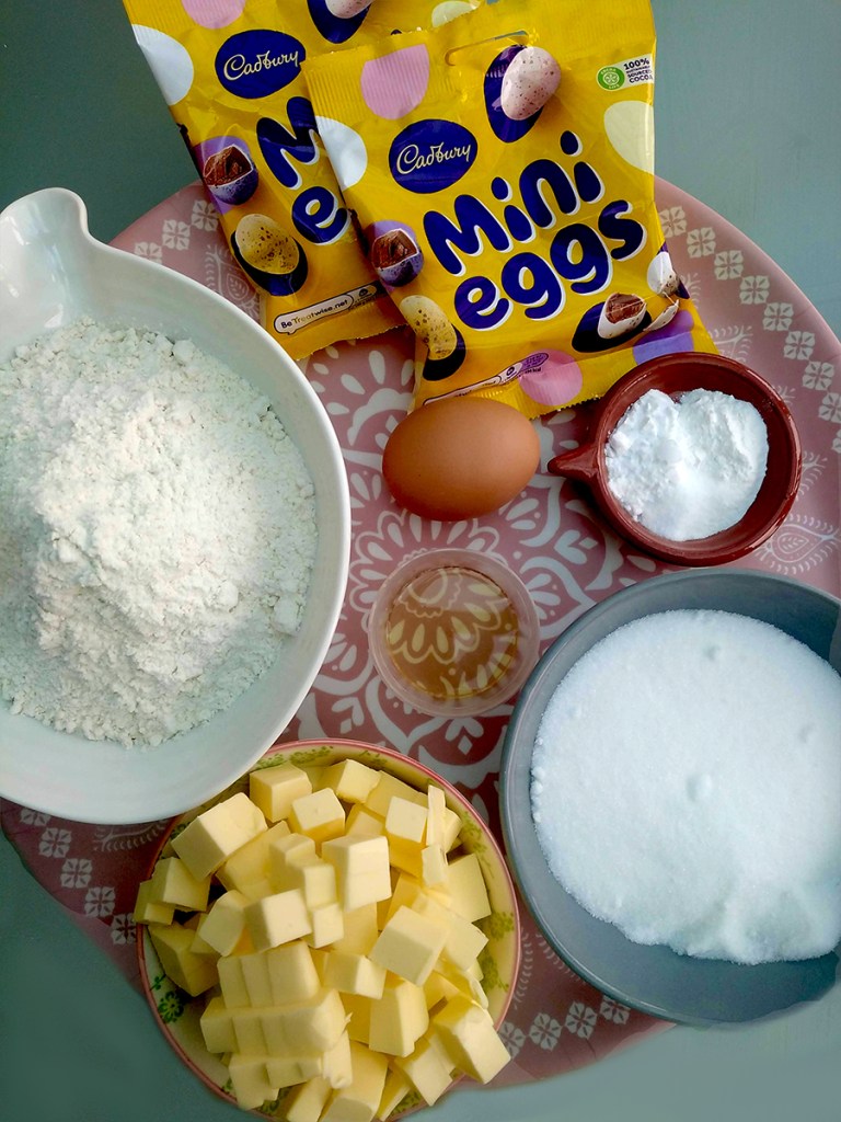 - Gradually add the flour mix to the wet ingredients and stir until all combined to create a dough. Give the unopened bag of mini eggs a bash with a rolling pin to crack some eggs.
