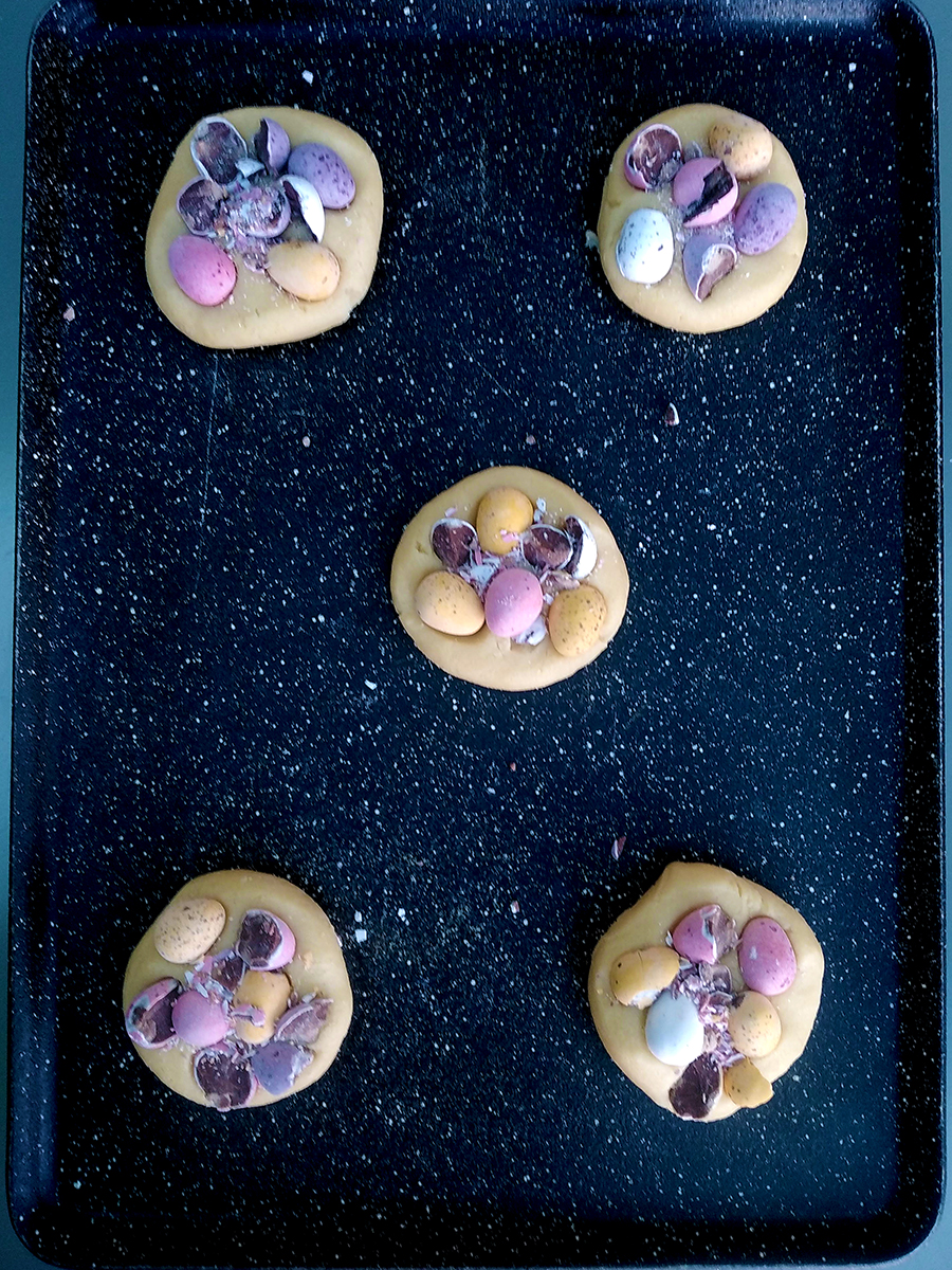 - Place the dough onto a baking sheet (leaving a radius of 3cm around each piece) then press whole and crushed pieces of mini eggs into the dough.