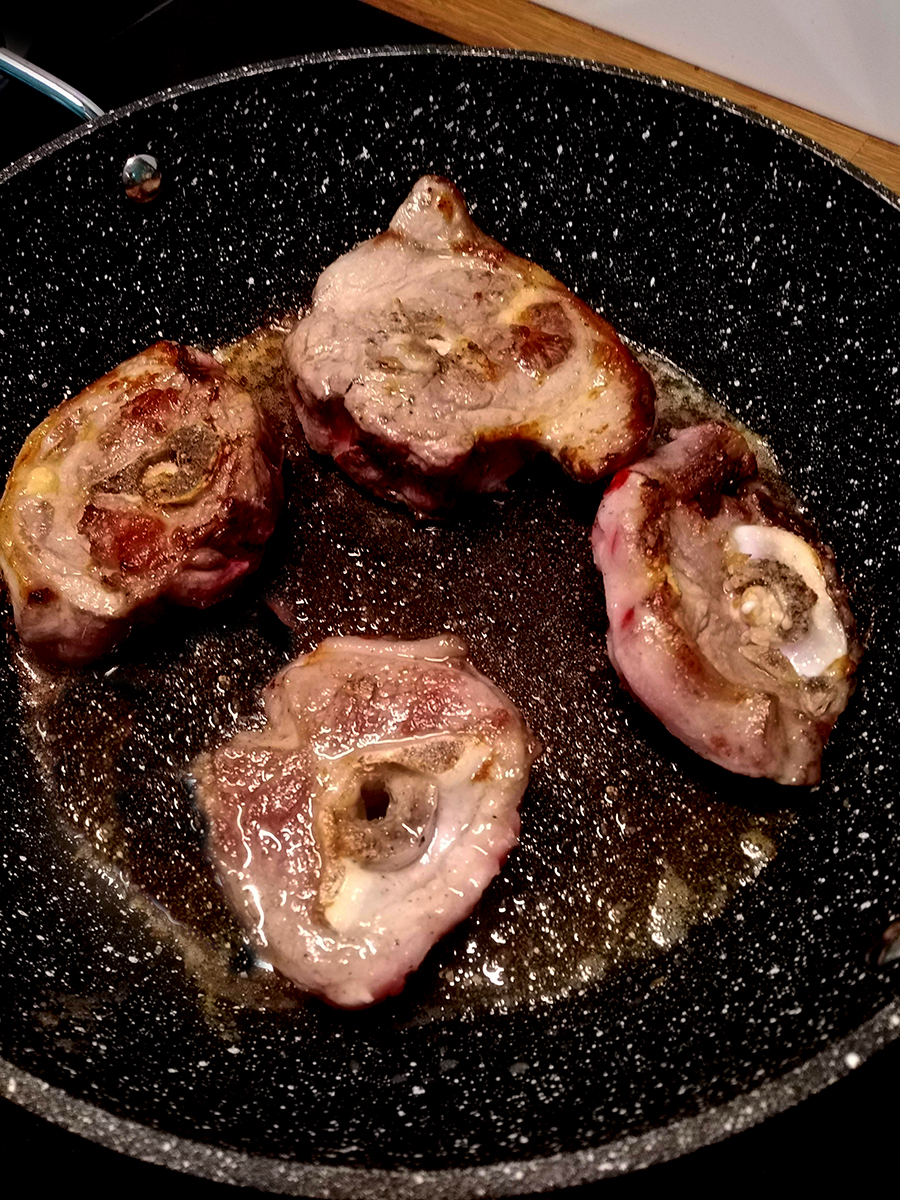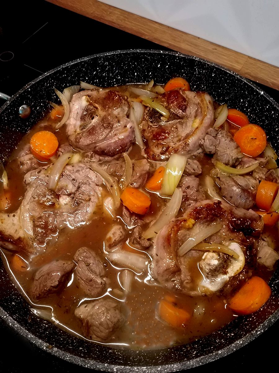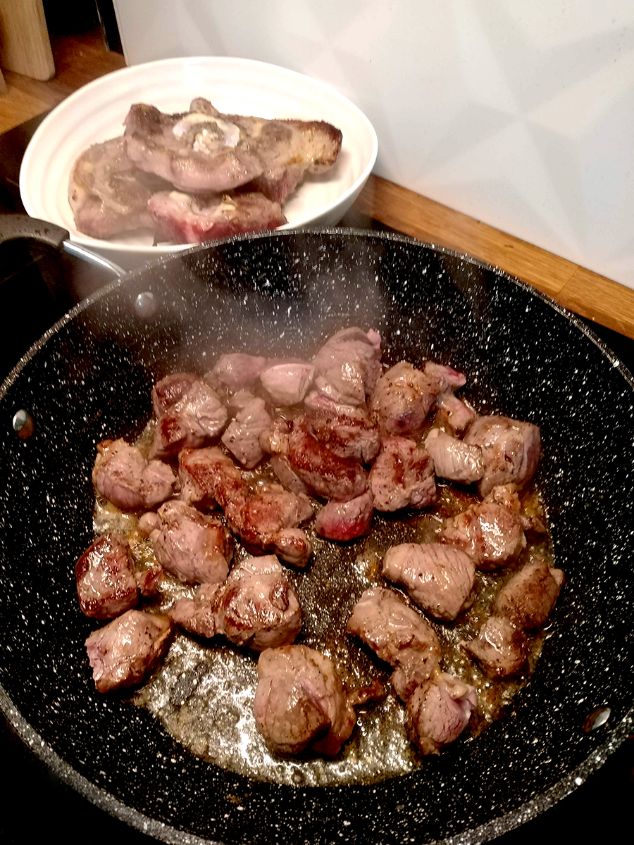 - Pre-heat the oven to 190° (170° Fan). Put the butter into a large cooker-to-oven casserole dish over a medium high heat then generously salt the bone-in lamb and brown for a couple of minutes of each side in the fat. Remove the lamb to a dish then salt and brown the filleted lamb until coloured all over then remove to the same dish.