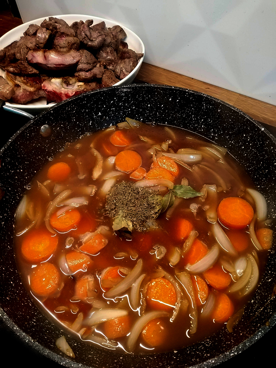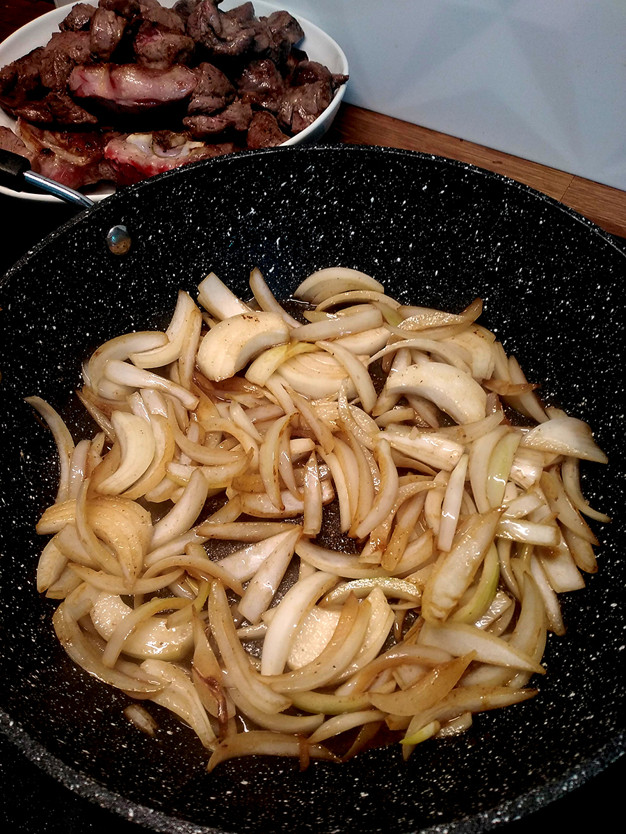 - Peel and slice the onion(s) and add to the casserole dish then add the Worcestershire sauce and deglaze the pan picking up any tasty bits from the bottom of the pan. Soften the onions for a few minutes then add the trimmed and chopped carrots and sprinkle over the flour.