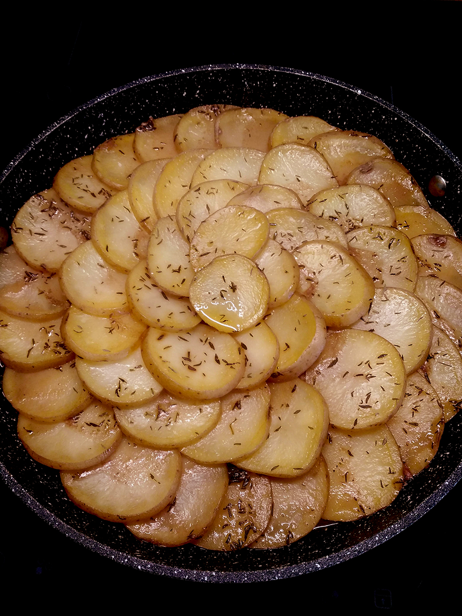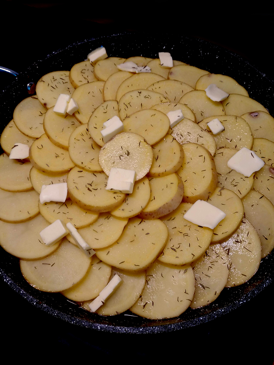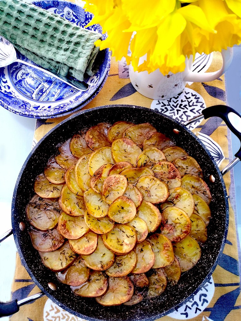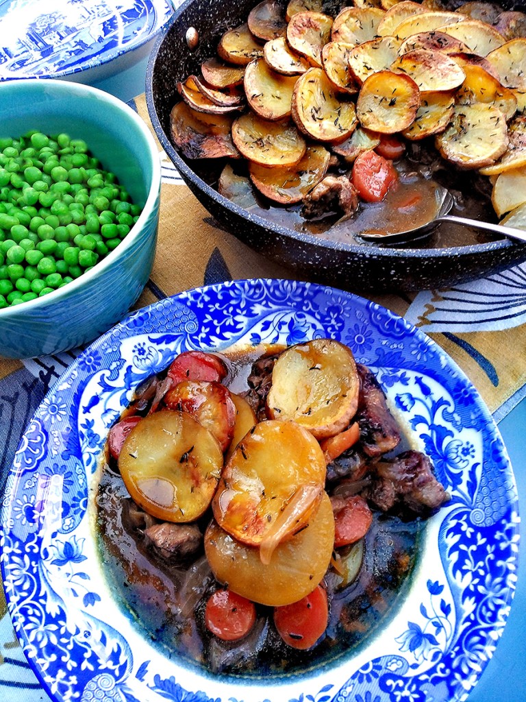 - Slice the potatoes into 3mm wide slices then arrange on top of the casserole, sprinkle with a little extra thyme and dots of butter. Put a lid on the casserole then into the oven, on the middle shelf, for 1 hour before removing the lid, turning the heat down to 170°C (150°C Fan) and cooking for a further hour. Grill the top for a few minutes if you want an extra crispy top.