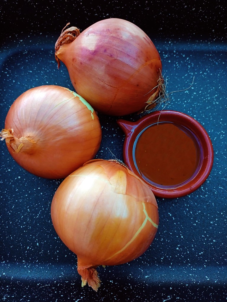 • Line a baking tin with greaseproof paper (use a tin not much bigger than your onion quarters laid flat). Drizzle over with olive oil and grind over a little salt.
