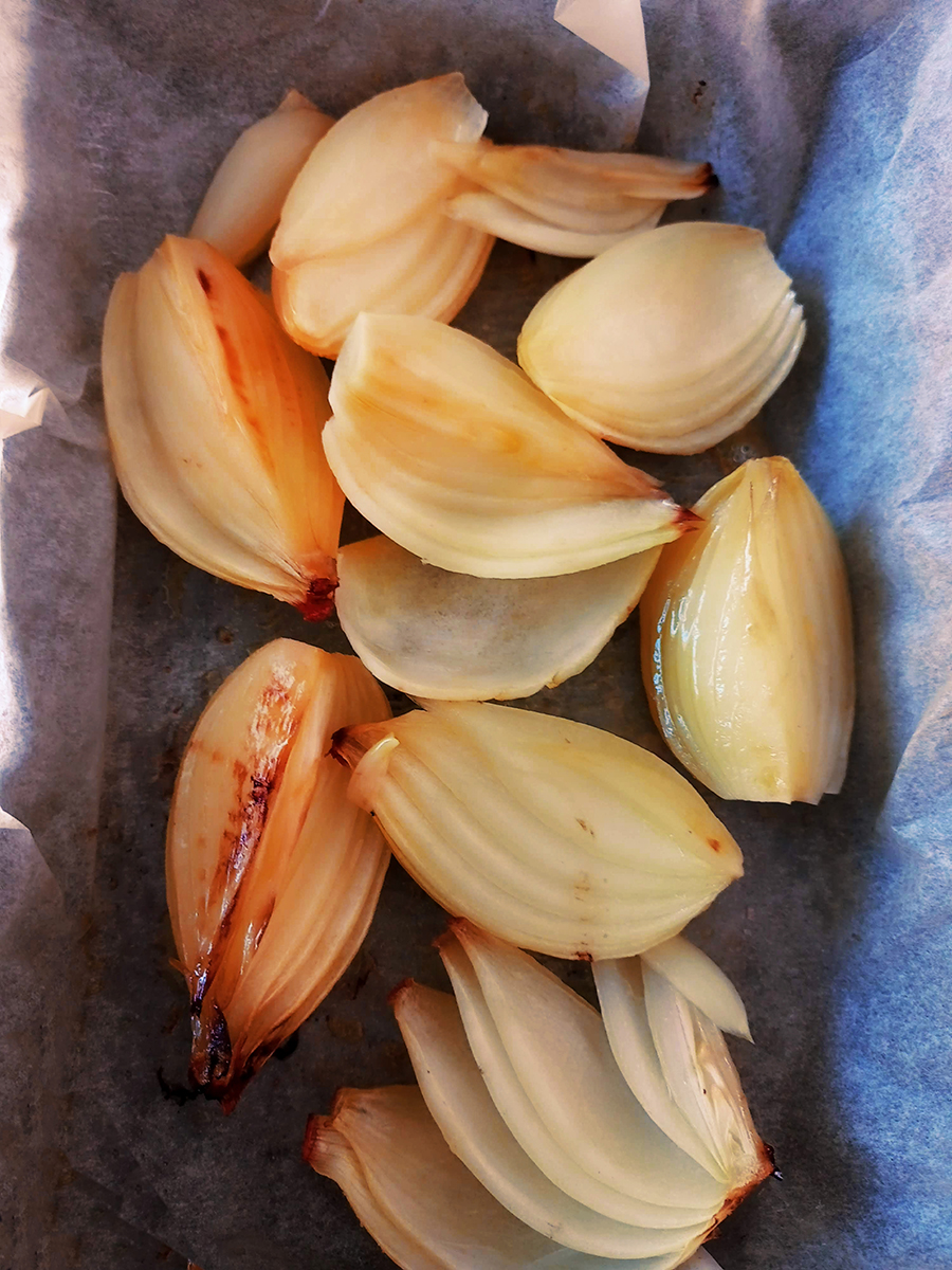 • Toss the onion quarters in the oil then place cut side down in the tin. Cover loosely with foil and roast in the oven for 40 minutes.