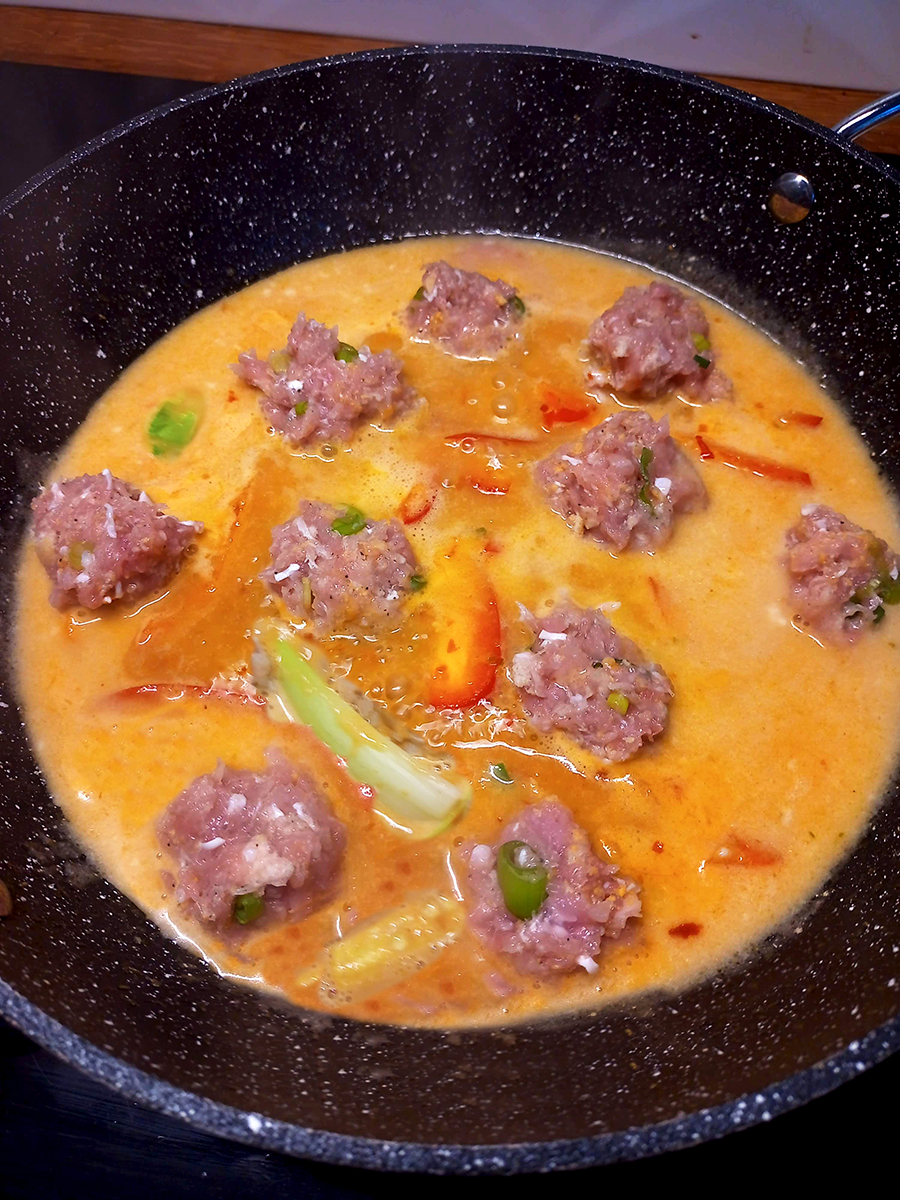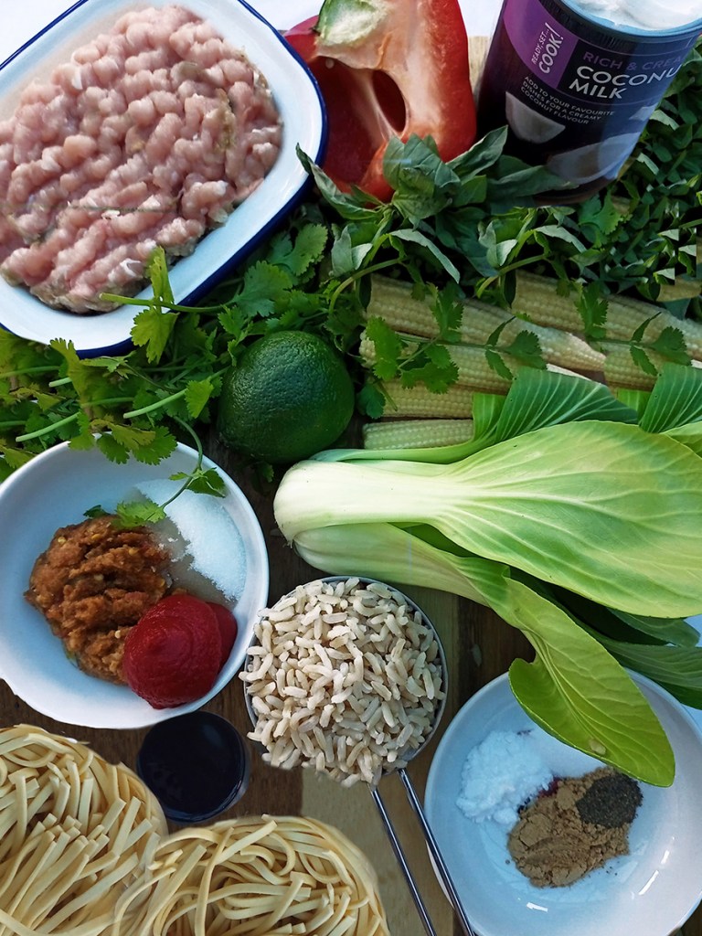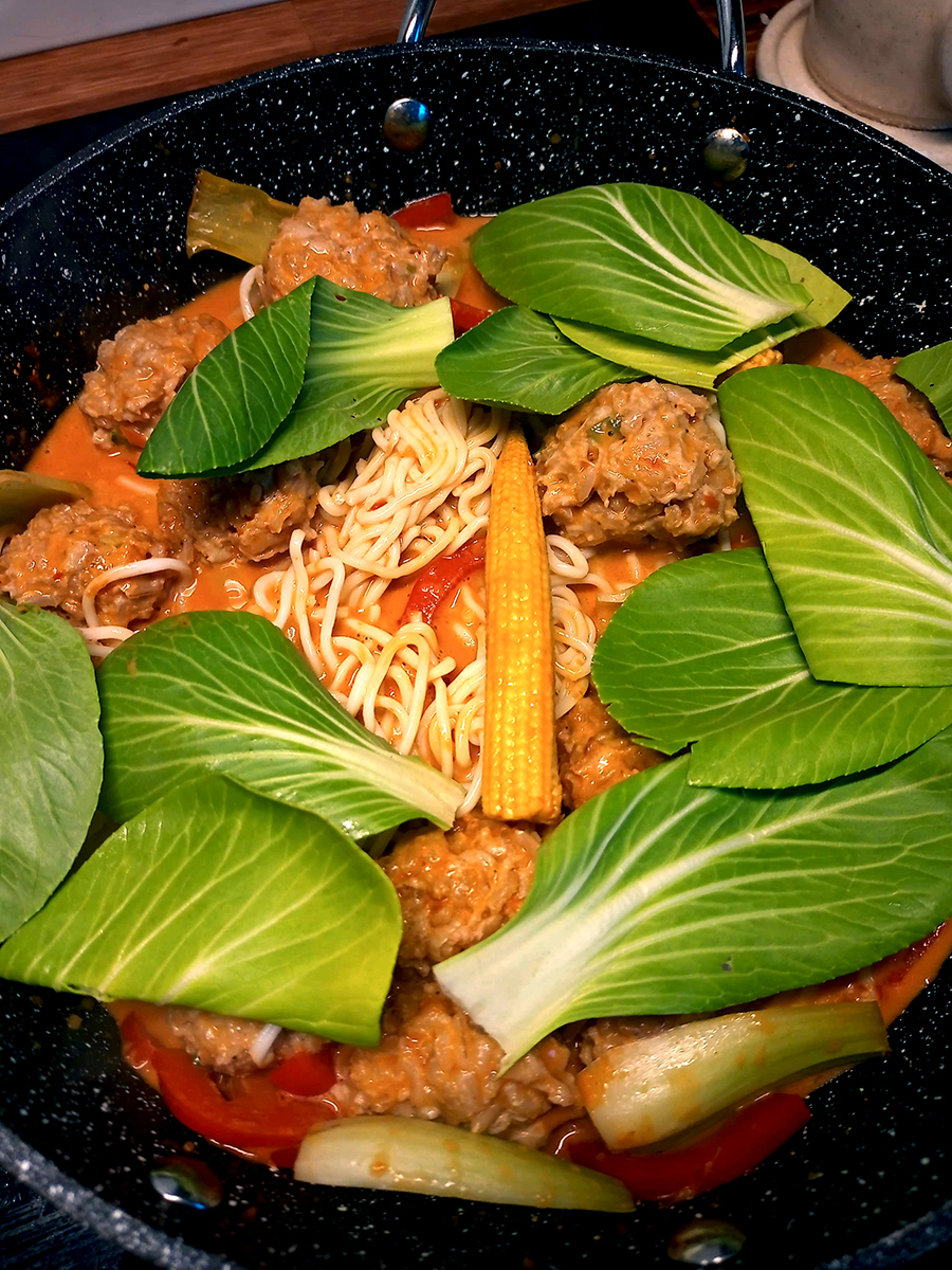 - Add the meatballs to the pan then place a lid on and cook for 7 minutes then remove the lid and add the pak choi leaves and cooked egg noodles (cook in a separate pan in salted boiling water) then cook for another minute before serving with the Thai basil, chopped coriander and a squeeze of lime.
