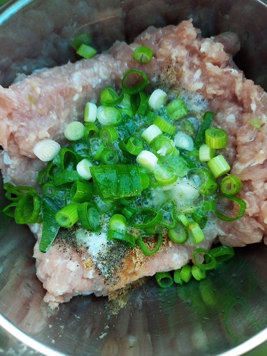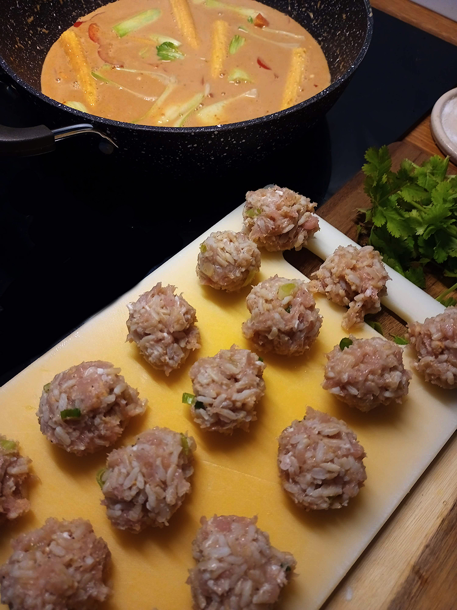 - Put the chicken into a mixing bowl and add the chopped spring onion. salt, pepper, ground ginger, baking soda and squeeze over the lime juice. The baking soda will fizz as you add the lime juice. Give everything a stir then add the cooked rice and stir again then form the mixture into meatballs and set aside.