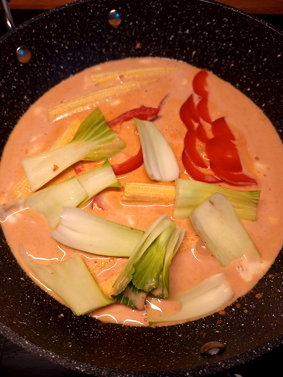 - Chop the red pepper and add to the pan along with the baby corn. Cut the leaves off the pak choi and chop the bulb into segments then add to the pan. **If you want to keep the pak choi whole then place the bulbs into a jug of boiling water (not immersing the leaves) then leave for 5 minutes before lifting out and adding to the sauce.